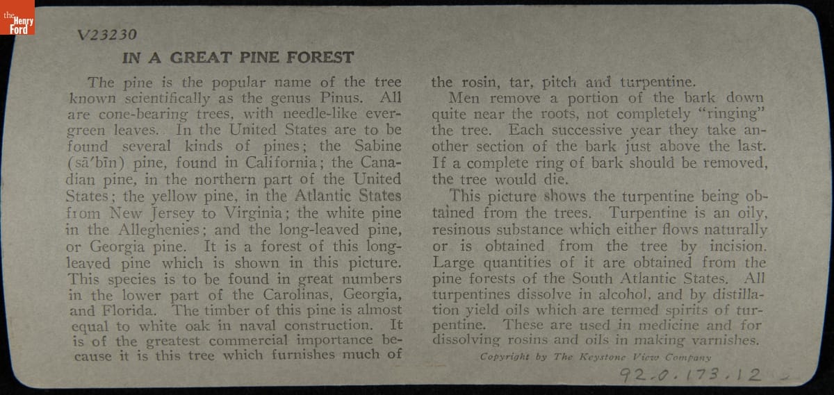 front, right side: Keystone View Company / Copyrighted, Underwood & Underwood / Manufacturers MADE IN U.S.A. Publishers front, top: 21 front, left side: Meadville, Pa., New York, N.Y. / Chicago, Ill., London, England front, bottom: V23230 - In a Great Pine Forest - Collecting Turpentine, / North Carolina
