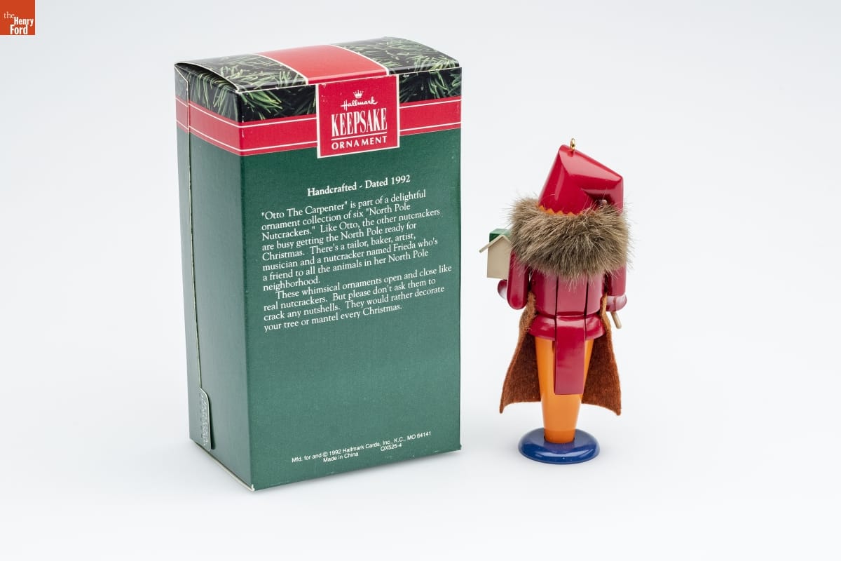 Hallmark / KEEPSAKE / ORNAMENT / Handcrafted - Dated 1992 / "Otto the Carpenter" is part of a delightful / ornament collection of six "North Pole / Nutcrackers." Like Otto, the other nutcrackers / are busy getting the North Pole ready for / Christmas. There's a tailor, baker, artist, / musician and a nutcracker named Frieda who's / a friend to all the animals in her North Pole / neighborhood. / These whimsical ornaments open and close like / real nutcrackers. But please don't ask them to / crack any nutshells. They would rather decorate / your tree or mantel every Christmas. / Mfd for and (C) 1992 Hallmark Cards, Inc., K.C., MO 64141 / Made in China QX525-4