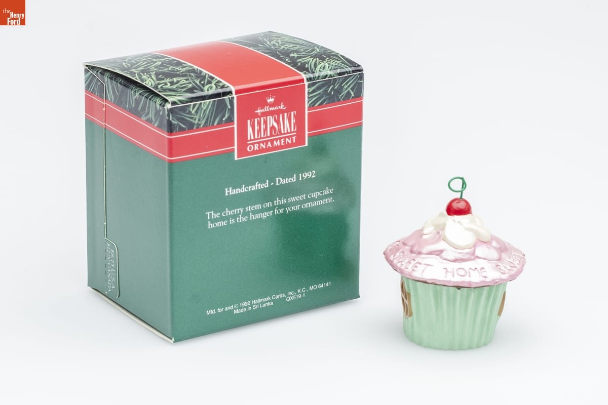Hallmark / KEEPSAKE / ORNAMENT / Handcrafted - Dated 1992 / The cherry stem on this sweet cupcake / home is the hanger for your ornament. / Mfd for and (C) 1992 Hallmark Cards, Inc., K.C., MO 64141 / Made in Sri Lanka QX519-1