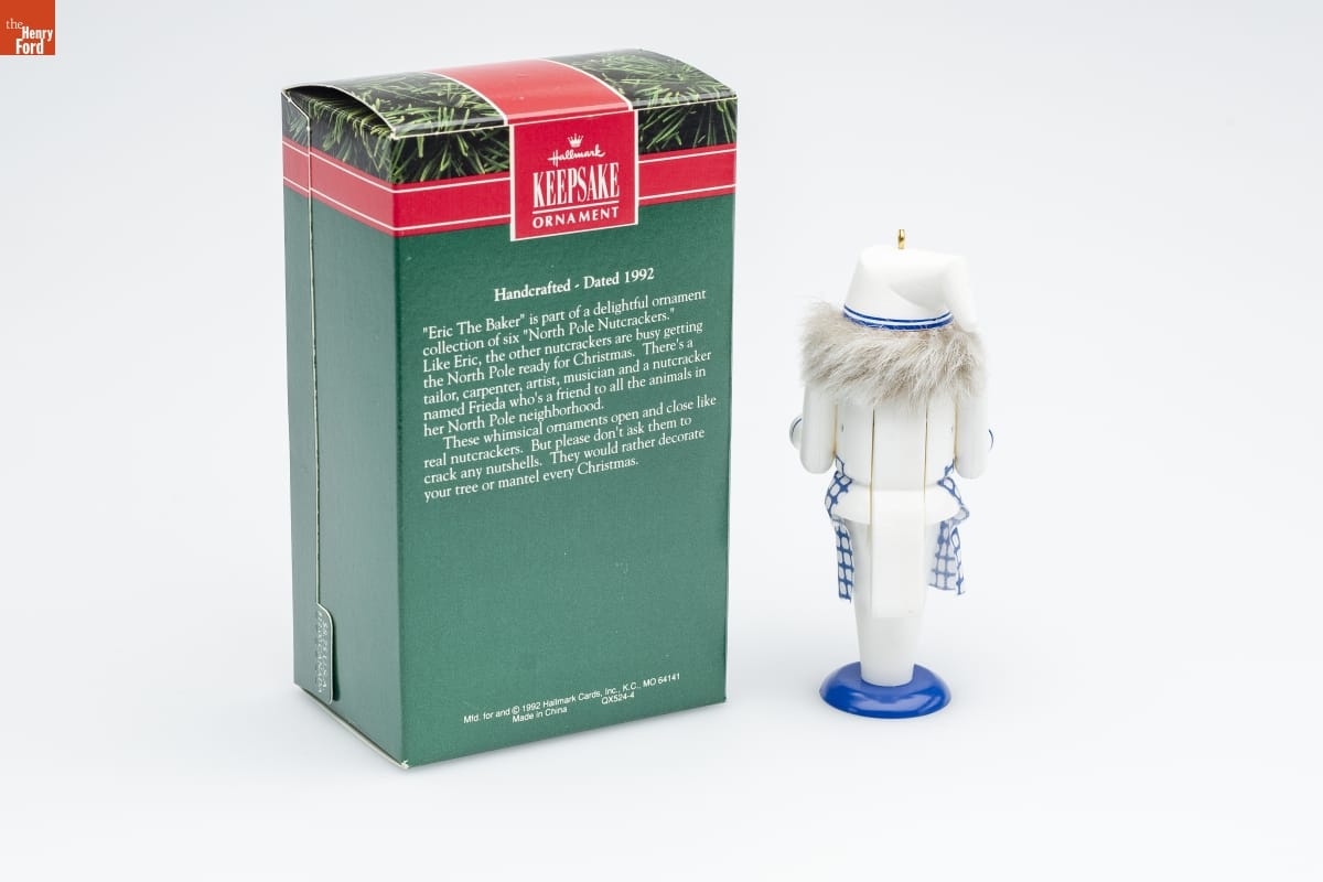 Hallmark / KEEPSAKE / ORNAMENT / Handcrafted - Dated 1992 / "Eric The Baker" is part of a delightful ornament / collection of six "North Pole Nutcrackers." / Like Eric, the other nutcrackers are busy getting / the North Pole ready for Christmas. There's a / tailor, carpenter, artist, musician and a nutcracker / named Frieda who's a friend to all the animals in / her North Pole neighborhood. / These whimsical ornaments open and close like / real nutcrackers. But please don't ask them to / crack any nutshells. They would rather decorate / your tree or mantel every Christmas. / Mfd for and (C) 1992 Hallmark Cards, Inc., K.C., MO 64141 / Made in China QX524-4