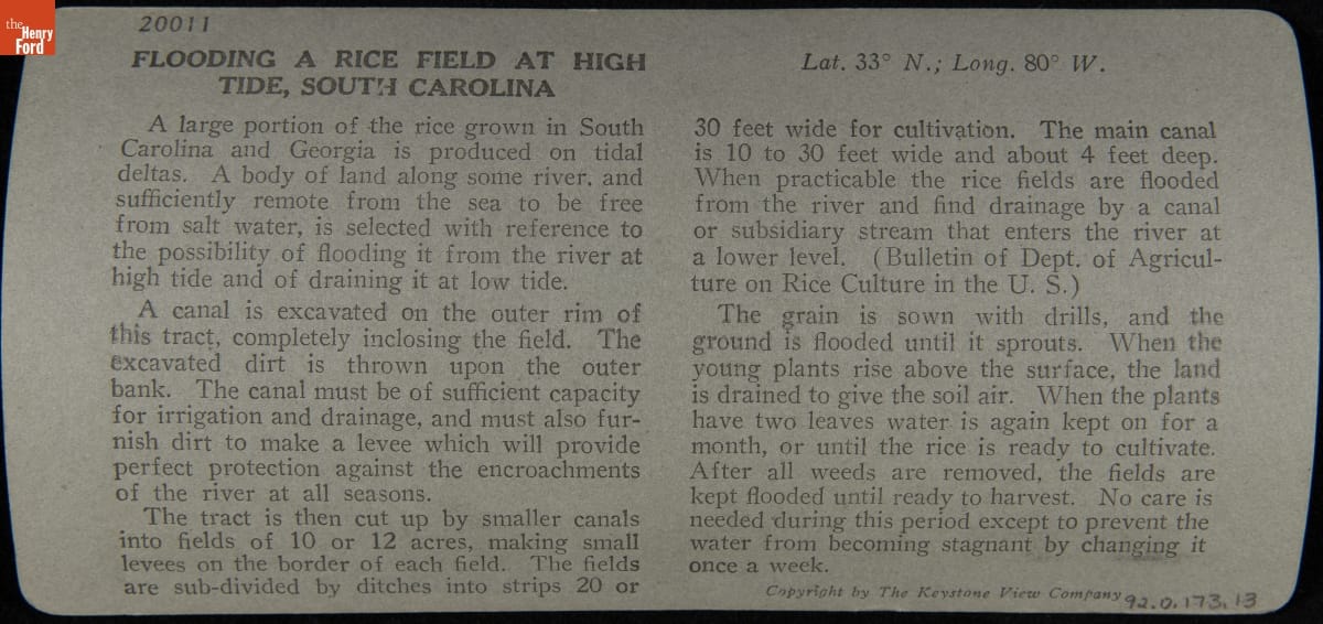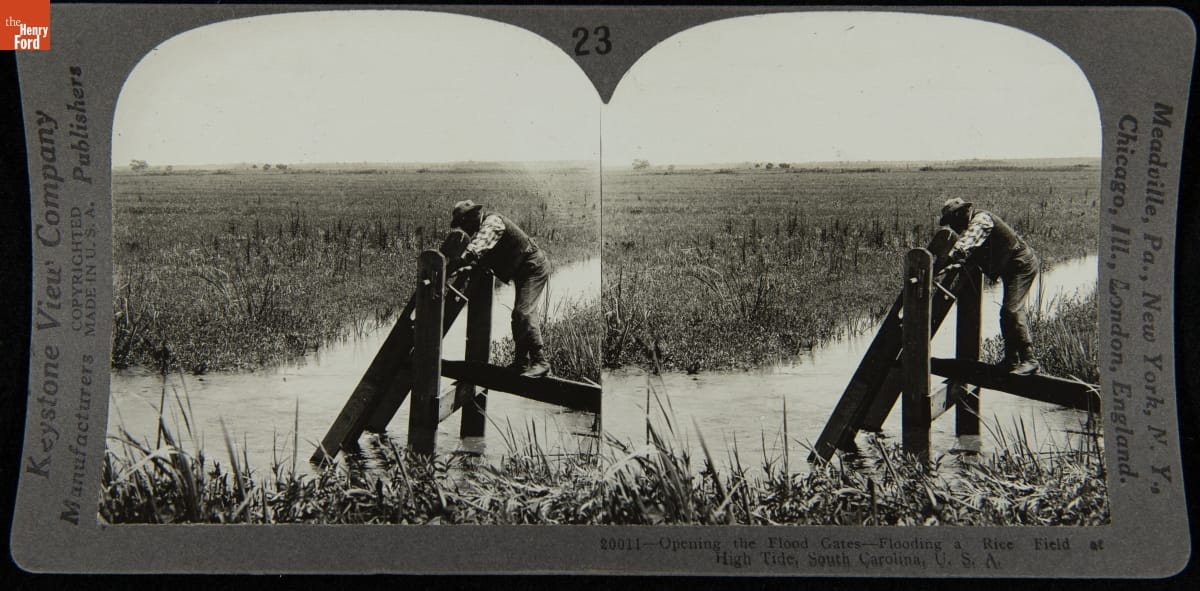 Rice grows best when fields are flooded at planting time and periodically during the growing season. Enslaved people built the infrastructure that rice required before the Civil War. After the war, rice cultivation expanded along the Gulf Coast. This stereograph shows a man tending the crop while the back educates viewers about U.S. rice cultivation during the late-19th and early-20th centuries.