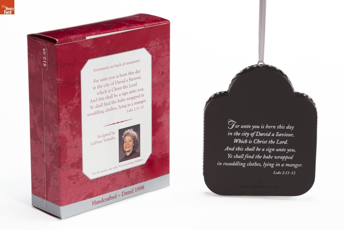 Sentiment on back of ornament. / For unto you is born this day / in the city of David a Saviour, / which is Christ the Lord. / And this shall be a sign unto you; / Ye shall find the babe wrapped / in swaddling clothes, lying in a manger. / Luke 2:11-12 / Sculpted by / LaDene Votruba / For decorative use only. Not for young children. / Handcrafted - Dated 1998