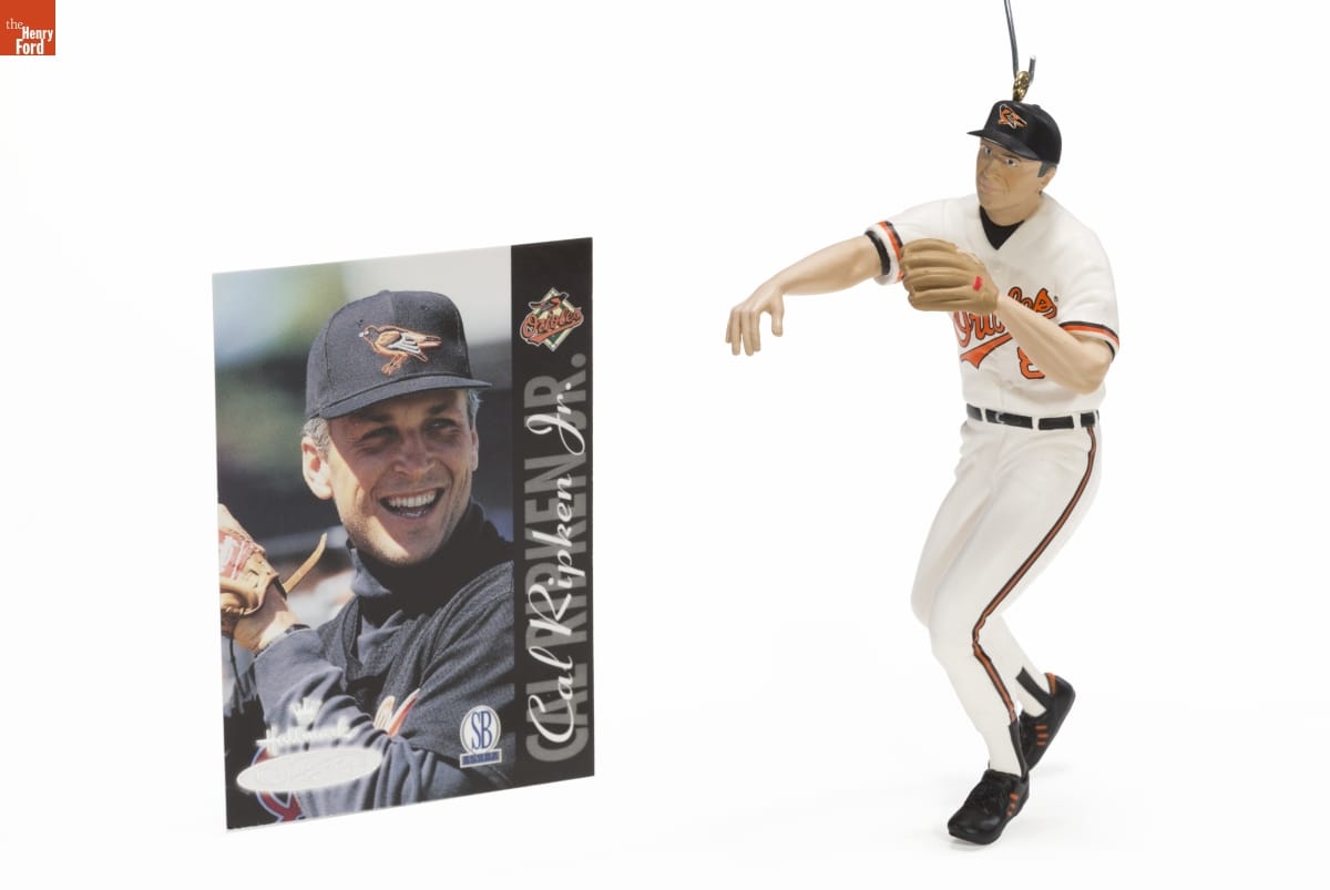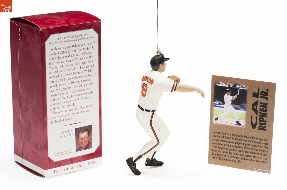 Third in the At the Ballpark Series. / Look for series verification 3 on this ornament. / With every game, Baltimore Orioles / standout Calvin Edwin "Cal" Ripken Jr. / adds to his remarkable career. Named / the American League Rookie of the / Year in 1982, he was the League's MVP / in 1983 and 1991 and has been named / to its All-Star team 14 times. Widely / admired for his commitment to play day / in and day out, in 1995 he surpassed / even the legendary Lou Gehrig's major league record of 2,130 consecutive / games played. Ripken spoke modestly / of setting the new record, "It was a / great day for baseball." / This series of Keepsake Ornaments / salutes the achievements of modern- / day baseball heroes. / Sculpted by / Dill Rhodus / For decorative use only. / Not for young children. / Handcrafted - Dated 1998