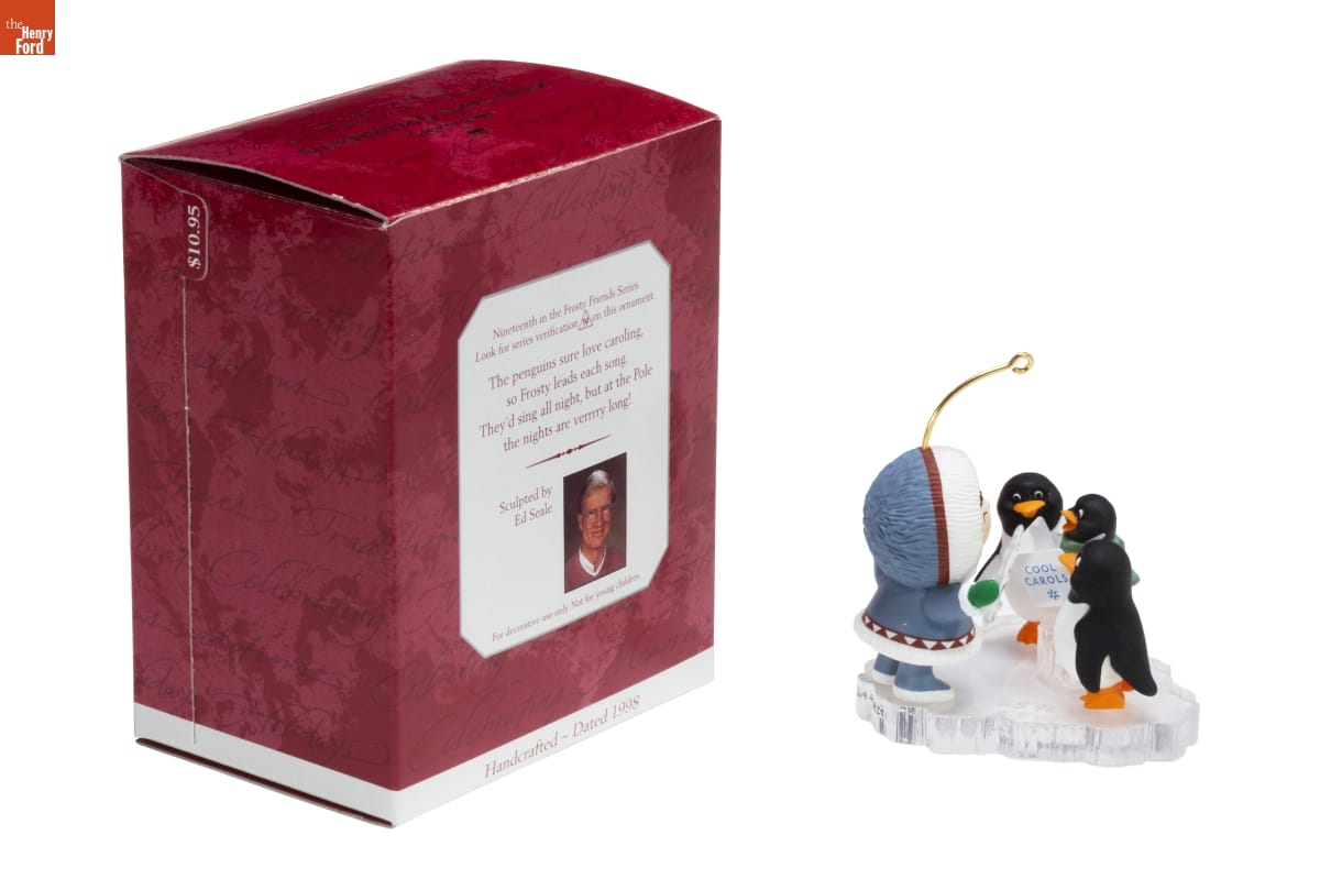 Nineteenth in the Frosty Friends Series. / Look for series verification 19 on this ornament. / The penguins sure love caroling, / so Frosty leads each song. / They'd sing all night, but at the Pole / the nights are verrrry long! / Sculpted by / Ed Seale / For decorative use only. Not for young children. / Handcrafted - Dated 1998