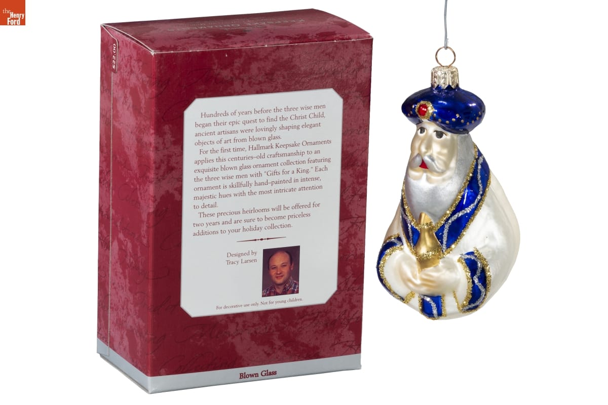 Hundreds of years before the three wise men / began their epic quest to find the Christ Child, / ancient artisans were lovingly shaping elegant / objects of art from blown glass. / For the first time, Hallmark Keepsake Ornaments / applies this centuries-old craftsmanship to an / exquisite blown glass ornament collection featuring / the three wise men with "Gifts for a King." Each / ornament is skillfully hand-painted in intense, / majestic hues with the most intricate attention / to detail. / These precious heirlooms will be offered for / two years and are sure to become priceless / additions to your holiday collection. / Designed by / Tracy Larsen / For decorative use only. Not for young children. / Blown Glass