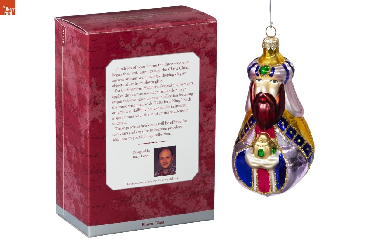 Hundreds of years before the three wise men / began their epic quest to find the Christ Child, / ancient artisans were lovingly shaping elegant / objects of art from blown glass. / For the first time, Hallmark Keepsake Ornaments / applies this centuries-old craftsmanship to an / exquisite blown glass ornament collection featuring / the three wise men with "Gifts for a King." Each / ornament is skillfully hand-painted in intense, / majestic hues with the most intricate attention / to detail. / These precious heirlooms will be offered for / two years and are sure to become priceless / additions to your holiday collection. / Designed by / Tracy Larsen / For decorative use only. Not for young children. / Blown Glass