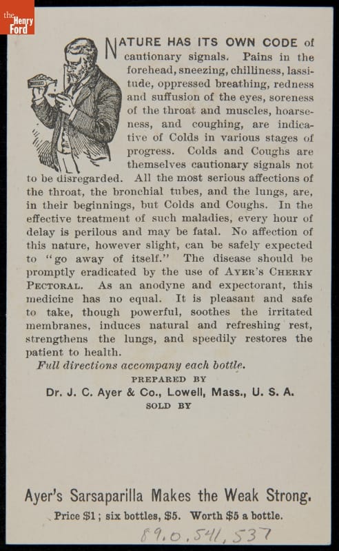These weather signal flags are in the company of a dancing troupe of anthropomorphic Ayer's cherry cough syrup bottles. The flags signal "cold wave coming," "storm approaching," and temperature changes as patterns that are similar to the common cold and flu. The reverse tells us that our body, like the weather, can be read by its warning systems.
