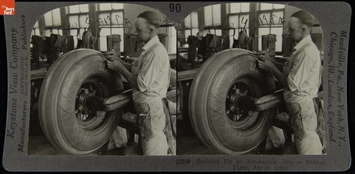 Tires were built on cylindrical drums. Plies were layered on the drum one at a time, and beads were added to the sides, to create what was called a carcass. The carcass was then removed from the drum and shaped in a tire mold. This stereograph shows part of the process at a tire factory in Akron, Ohio, about 1900.