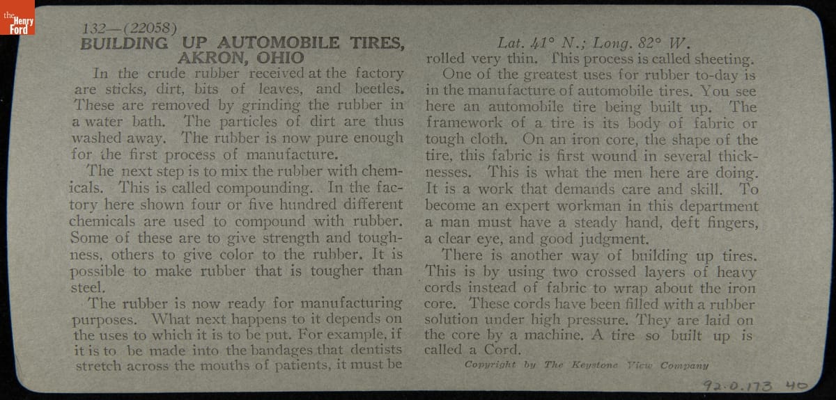 front, bottom: 22058 Building UP an Automobile Tire in Rubber / Plant, Akron, Ohio.