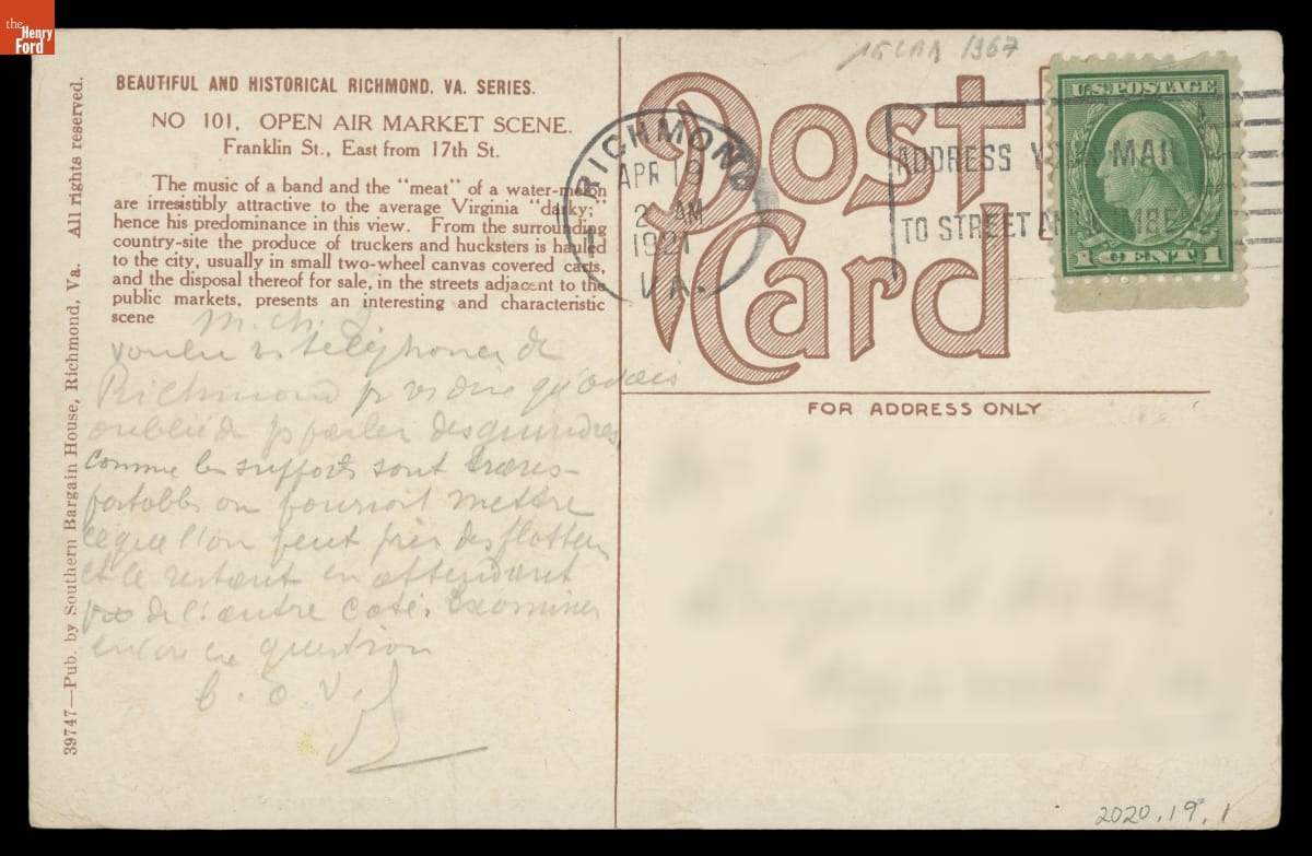 back, top right: BEAUTIFUL AND HISTORICAL RICHMOND, VA. SERIES. / NO 101, OPEN AIR MARKET SCENE. / Franklin St., East from 17th St. / The music of a band and the "meat" of a water-melon / are irresistibly attractive to the average Virginia "darky;" / hence his predominance in this view. From the surrounding / country-site the produce of truckers and hucksters is hauled / to the city, usually in small two-wheel canvas covered carts, / and the disposal thereof for sale, in the streets adjacent to the / public markets, presents an interesting and characteristic / scene.