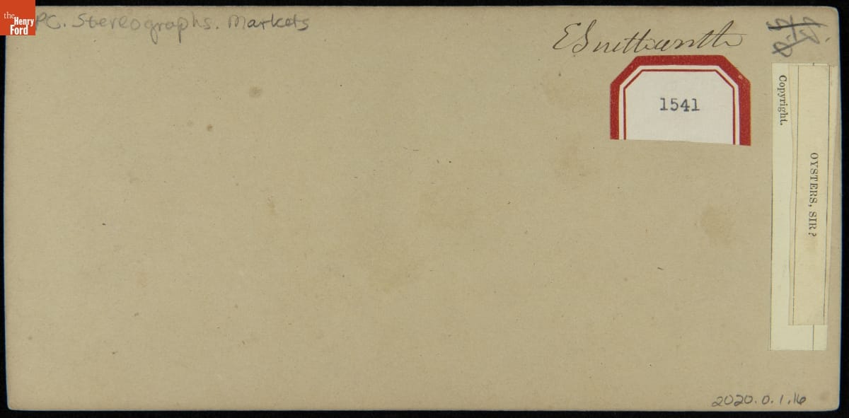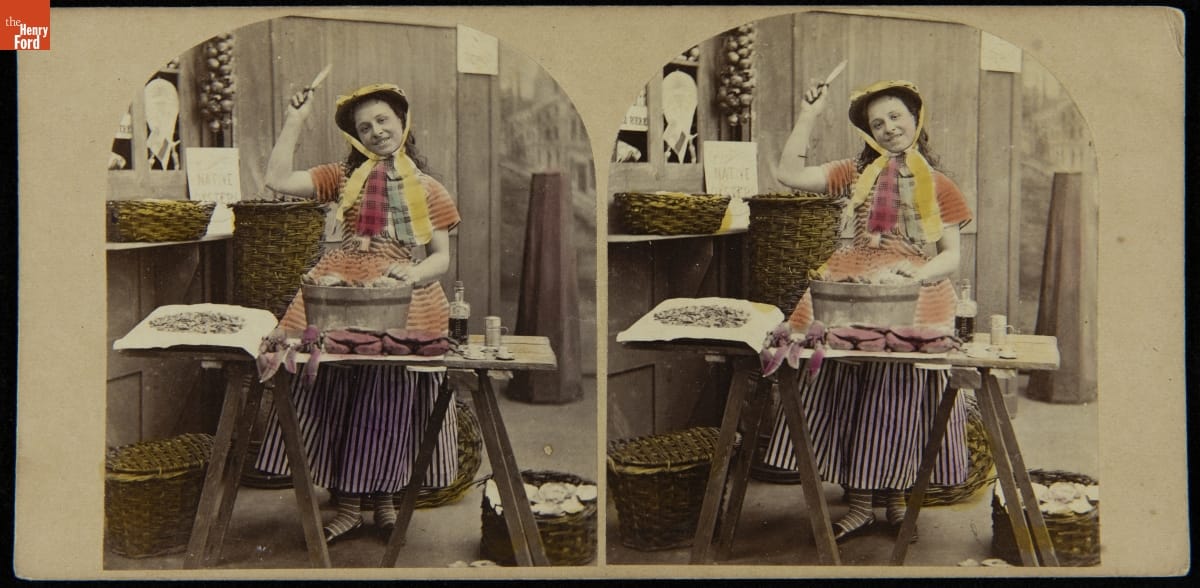 Fresh oysters are a delicacy, historically available only during certain months of the year. Oystermen did not harvest between May and August when oysters spawned. This replenished the supply and ensured continued harvests. The girl in this stereograph might have stood out in the crowd of shuckers at a typical East Coast urban market, luring customers to try her "native" oysters from nearby banks.