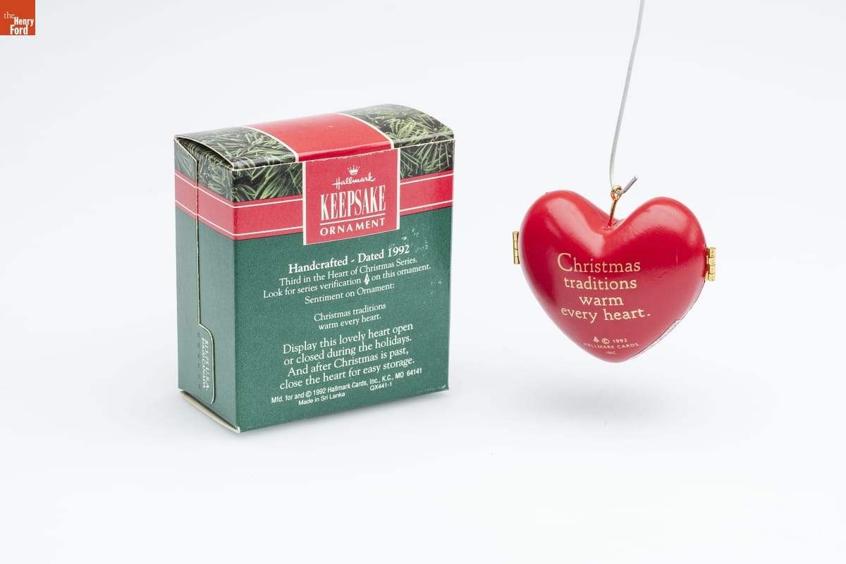 Hallmark / KEEPSAKE / ORNAMENT / Handcrafted - Dated 1992 / Third in the Heart of Christmas Series. Look for series verification 3 on this ornament. / Sentiment on Ornament: / Christmas traditions / warm every heart. / Display this lovely heart open / or closed during the holidays. / And after Christmas is past, / close the heart for easy storage. / Mfd. for and (C) 1992 Hallmark Cards, Inc., K.C., MO 64141 / Made in Sri Lanka QX441-1