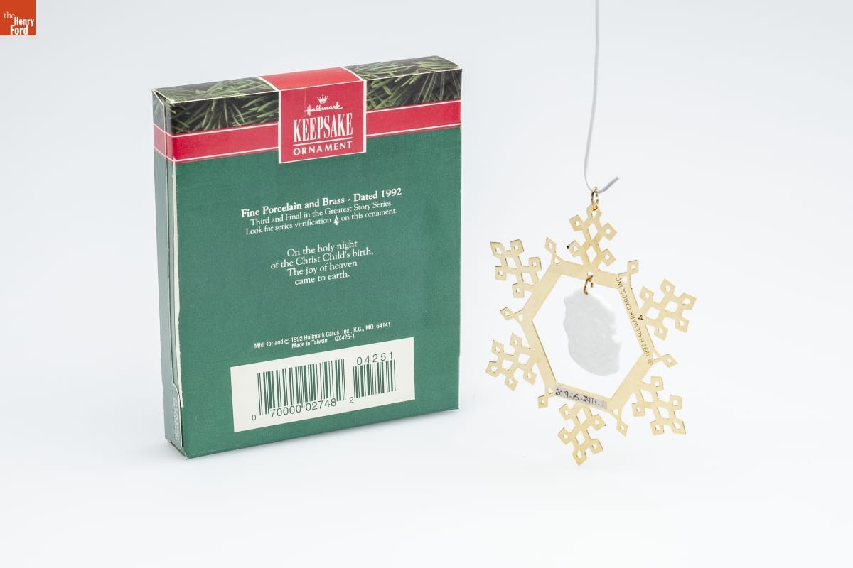 Hallmark / KEEPSAKE / ORNAMENT / Fine Porcelain and Brass - Dated 1992 / Third and Final in the Greatest Story Series. / Look for series verification 3 on this ornament. / On the holy night / of the Christ Child's birth, / The joy of heaven / came to earth. / Mfd for and (C) 1992 Hallmark Cards, Inc., K.C., MO 64141 / Made in Taiwan QX425-1