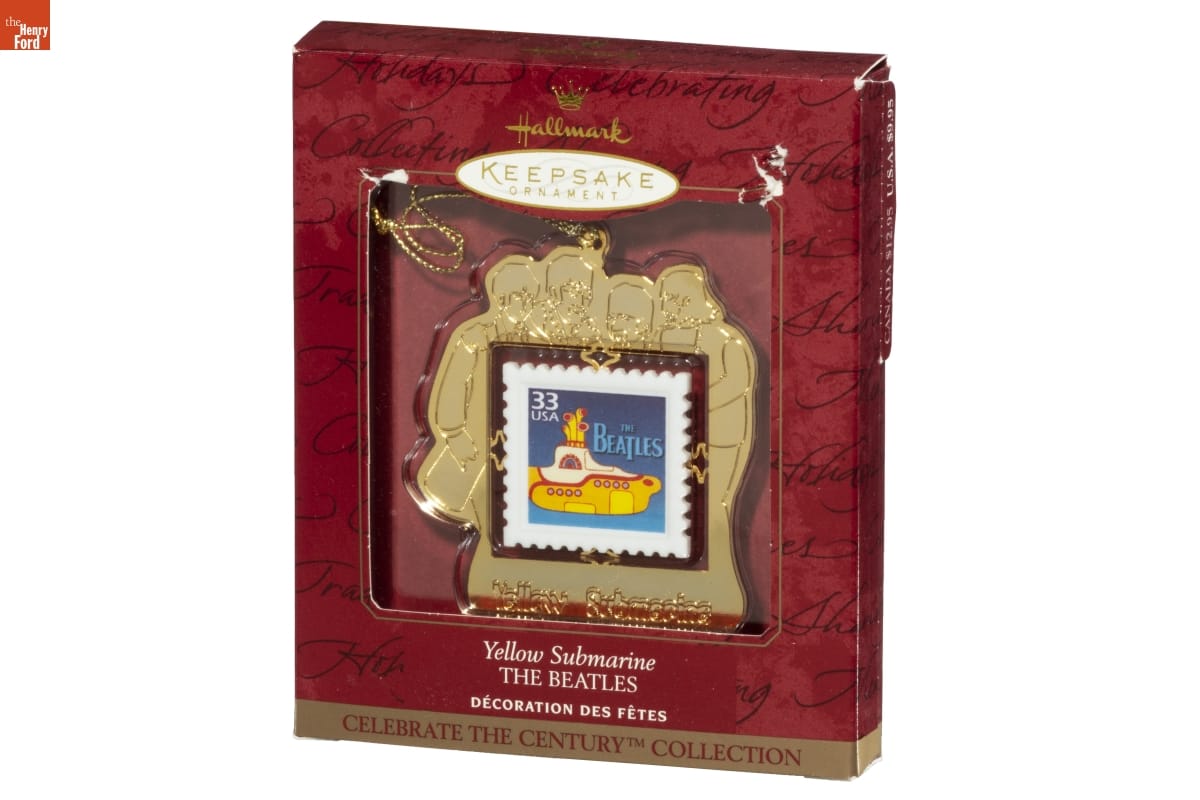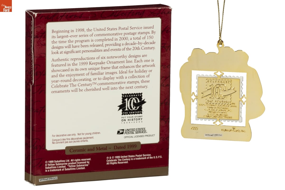 Beginning in 1998, the United States Postal Service issued / its largest-ever series of commemorative postage stamps. By / the time the program is completed in 2000, a total of 150 / designs will have been released, providing a decade-by-decade / look at significant personalities and events of the 20th Century. / Authentic reproductions of six noteworthy designs are / featured in the 1999 Keepsake Ornament line. Each one is / showcased in its own unique frame that enhances the artwork / and the enjoyment of familiar images. Ideal for holiday or / year-round decorating, or to display with a collection of / Celebrate The Century commemorative stamps, these / ornaments will be cherished well into the next century. / CELEBRATE / 100 / THE CENTURY / PUT YOUR STAMP / ON HISTORY / 1900-2000 / UNITED STATES / POSTAL SERVICE / OFFICIAL LICENSED PRODUCT / For decorative use only. Not for young children. / Concue a des fins decoratives seulement. / Ne convient pas aux jeunes enfants. / Ceramic and Metal - Dated 1999 / (C) 1999 Subafilms Ltd. All rights reserved. / A Yellow Submarine product licensed by / Subafilms Limited. "Yellow Submarine" / is a trademark of Subafilms Limited. / (R) & (C) United States Postal Service. / Celebrate The Century is a trademark of the U.S.P.S. / All Rights Reserved.