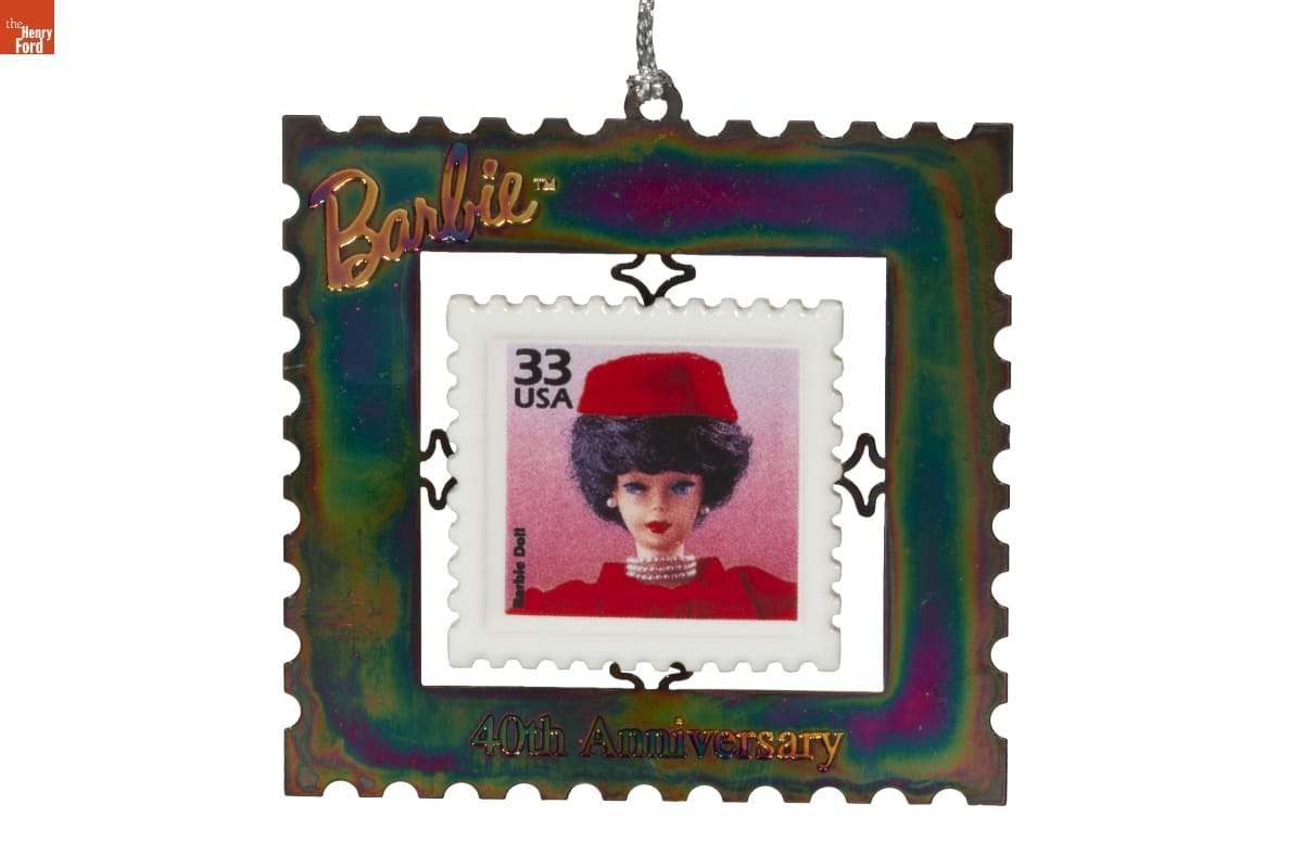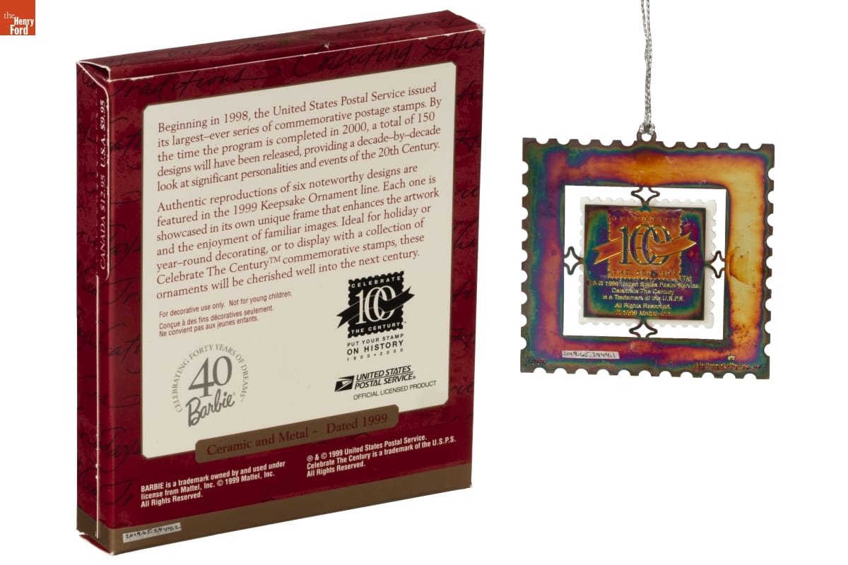 Beginning in 1998, the United States Postal Service issued / its largest-ever series of commemorative postage stamps. By / the time the program is competed in 2000, a total of 150 / designs will have been released, providing a decade-by-decade / look at significant personalities and events of the 20th Century. / Authentic reproductions of six noteworthy designs are / featured in the 1999 Keepsake Ornament line. Each one is / showcased in its own unique frame that enhances the artwork / and the enjoyment of familiar images. Ideal for holiday or / year-round decorating, or to display with a collection of / Celebrate The Century commemorative stamps, these / ornaments will be cherished well into the next century. / CELEBRATE / 100 / THE CENTURY / PUT YOUR STAMP / ON HISTORY / 1900-2000 / UNITED STATES / POSTAL SERVICE / OFFICIAL LICENSED PRODUCT / For decorative use only. Not for young children. / Concue a des fins decoratives seulement. / Ne convient pas aux jeunes enfants. / CELEBRATING FORTY YEARS OF DREAMS / 40 / Barbie / Ceramic and Metal - Dated 1999 / BARBIE is a trademark owned by and used under / license from Mattel, Inc. (C) 1999 Mattel, Inc. / All Rights Reserved / (R) & (C) United States Postal Service. / Celebrate The Century is a trademark of the U.S.P.S. / All Rights Reserved.