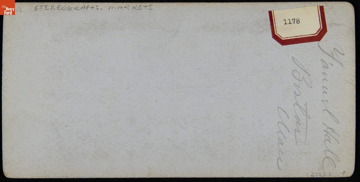 Railway passengers relied on entrepreneurial news agents and stationers to provide magazines, newspapers, cigars, candy, and other amenities to make traveling more enjoyable. John Cross probably offered a variety of stereographs showing Boston landmarks -- including this one of Faneuil Hall -- to travelers on southeastern Massachusetts' Old Colony railroad.