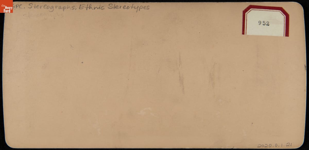 This stereograph shows a man about to nab a hen from her roost. The scene reinforced racist views by denigrating a black man as a "chicken thief." The caption, in dialect, further vilified rural black culture as uneducated. The Dominique hens likewise factored into the overt racist message through their association with Euro-centric colonial revival ideals, a stark contrast to the New Negro movement launched in 1895.