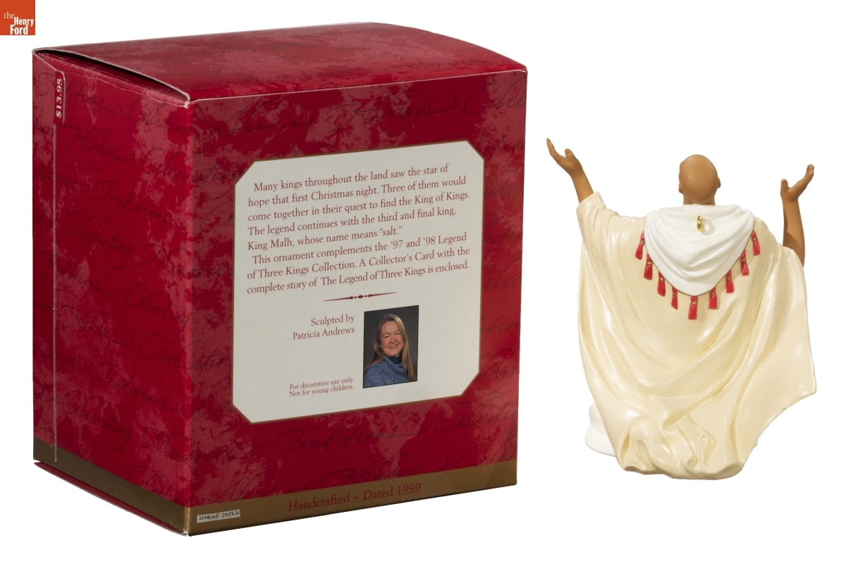 on front of card: Legend of Three Kings / Many kings throughout the land saw the star of hope that / first Christmas night. Three of them from the ancient continent / of Africa would come together in their quest to find the King / of Kings. / The legend unfolds [...] on front of packaging: Hallmark / KEEPSAKE / ORNAMENT / King Malh - Third King / Legend of Three Kings Collection on back of packaging: Many kings throughout the land saw the star of / hope that first Christmas night. Three of them would / come together in their quest to find the King of Kings. / The legend continues with the third and final king, / King Malh, whose name means "salt." / This ornament complements the '97 and '98 Legend / of Three Kings Collection. A Collector's Card with the / complete story of The Legend of Three Kings is enclosed. / Sculpted by / Patricia Andrews / For decorative use only / Not for young children. / Handcrafted - Dated 1999 on top of packaging: Hallmark on bottom of packaging: Mfd. for and (C) Hallmark Cards, Inc., Kansas City, MO 64141 / Made in China QX6797