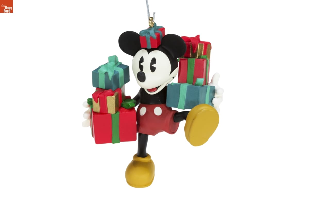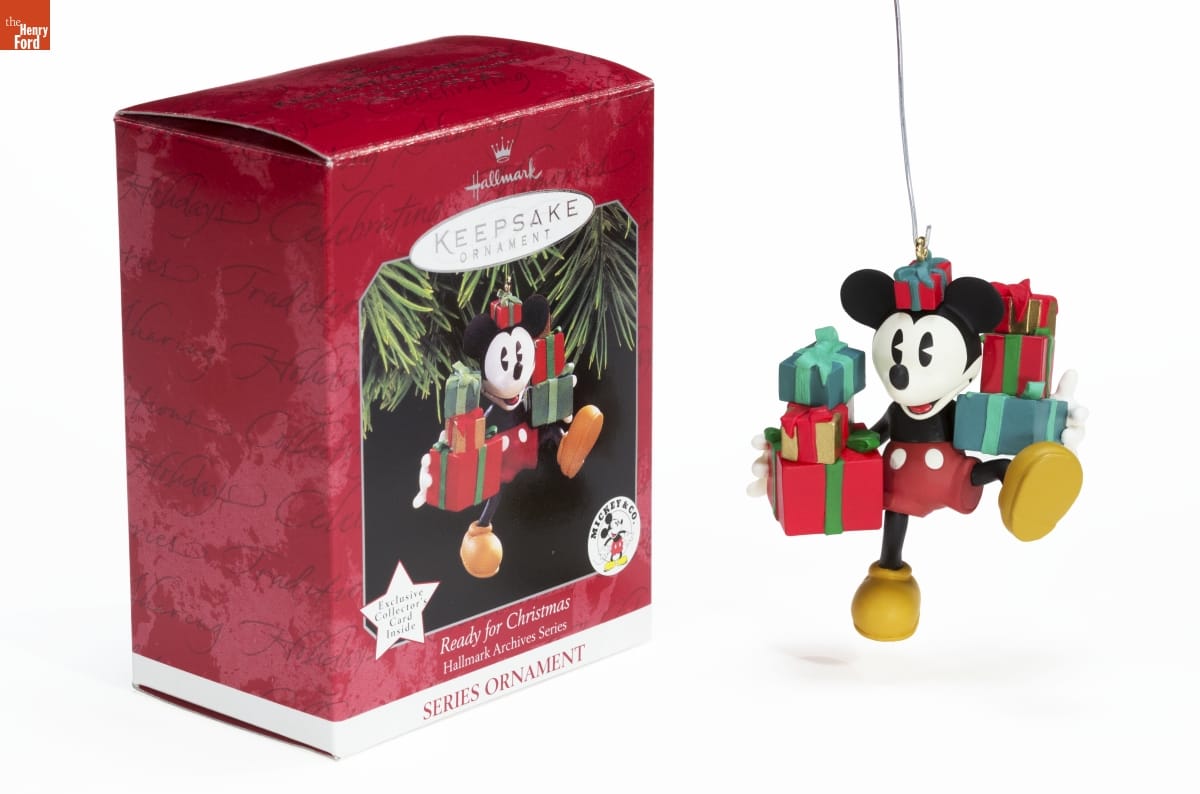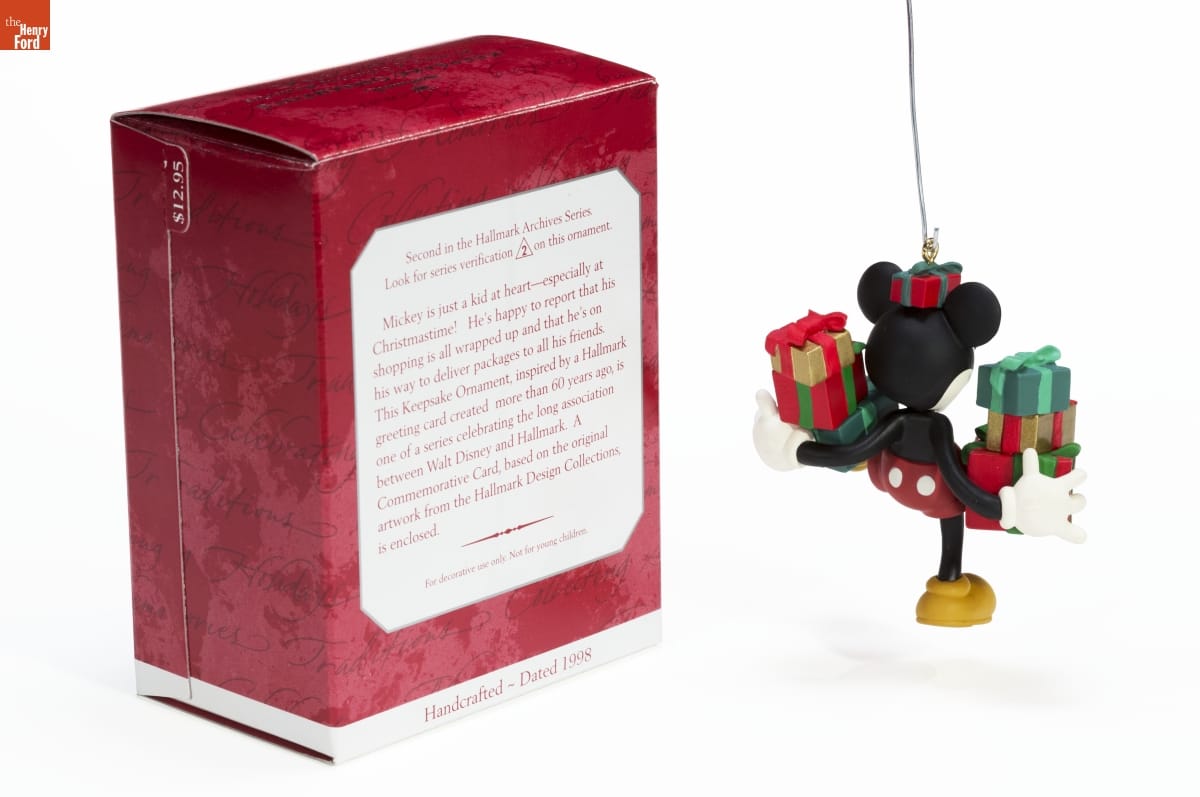 Second in the Hallmark Archives Series. / Look for series verification 2 on this ornament. / Mickey is just a kid at heart--especially at / Christmastime! He's happy to report that his / shopping is all wrapped up and that he's on / his way to deliver packages to all his friends. / This Keepsake Ornament, inspired by a Hallmark / greeting card created more than 60 years ago, is / one of a series celebrating the long association / between Walt Disney and Hallmark. A / Commemorative Card, based on the original / artwork from the Hallmark Design Collections, / is enclosed. / For decorative use only. Not for young children / Handcrafted - Dated 1998