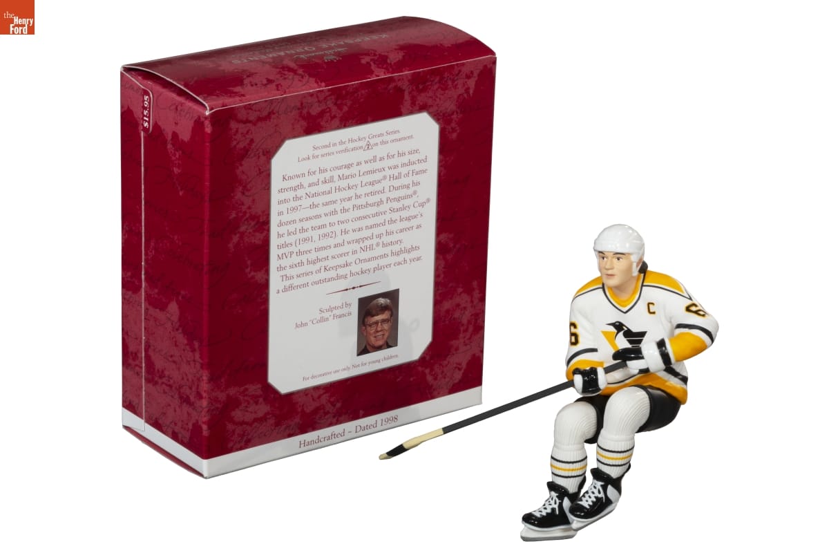 Second in the Hockey Greats Series. / Look for series verification 2 on this ornament. / Known for his courage as well as for his size, / strength, and skill, Mario Lemieux was inducted / into the National Hockey League(R) Hall of Fame / in 1997--the same year he retired. During his / dozen seasons with the Pittsburgh Penguins(R), / he led the team to two consecutive Stanley Cup(R) / titles (1991, 1992). He was named the league's / MVP three times and wrapped up his career as / the sixth highest scorer in NHL(R) history. / This series of Keepsake Ornaments highlights / a different outstanding hockey player each year. / Sculpted by / John "Collin" Francis / For decorative use only. Not for young children. / Handcrafted -Dated 1998
