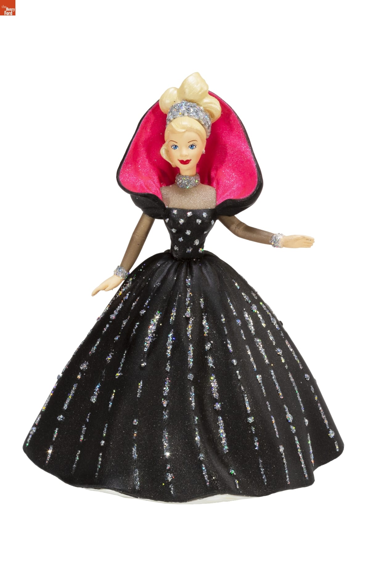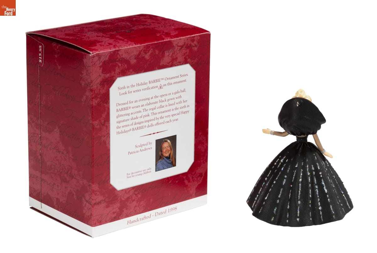 Sixth in the Holiday BARBIE TM Ornament Series. / Look for series verification 6 on this ornament. / Dressed for an evening at the opera or a gala ball, / BARBIE (R) wears an elaborate black gown with / glittering accents. The regal collar is lined with her / signature shade of pink. This ornament is the sixth in / the series of designs inspired by the very special Happy / Holidays(R) BARBIE(R) dolls offered each years. / Sculpted by / Patricia Andrews / For decorative use only. / Not for young children. / Handcrafted - Dated 1998