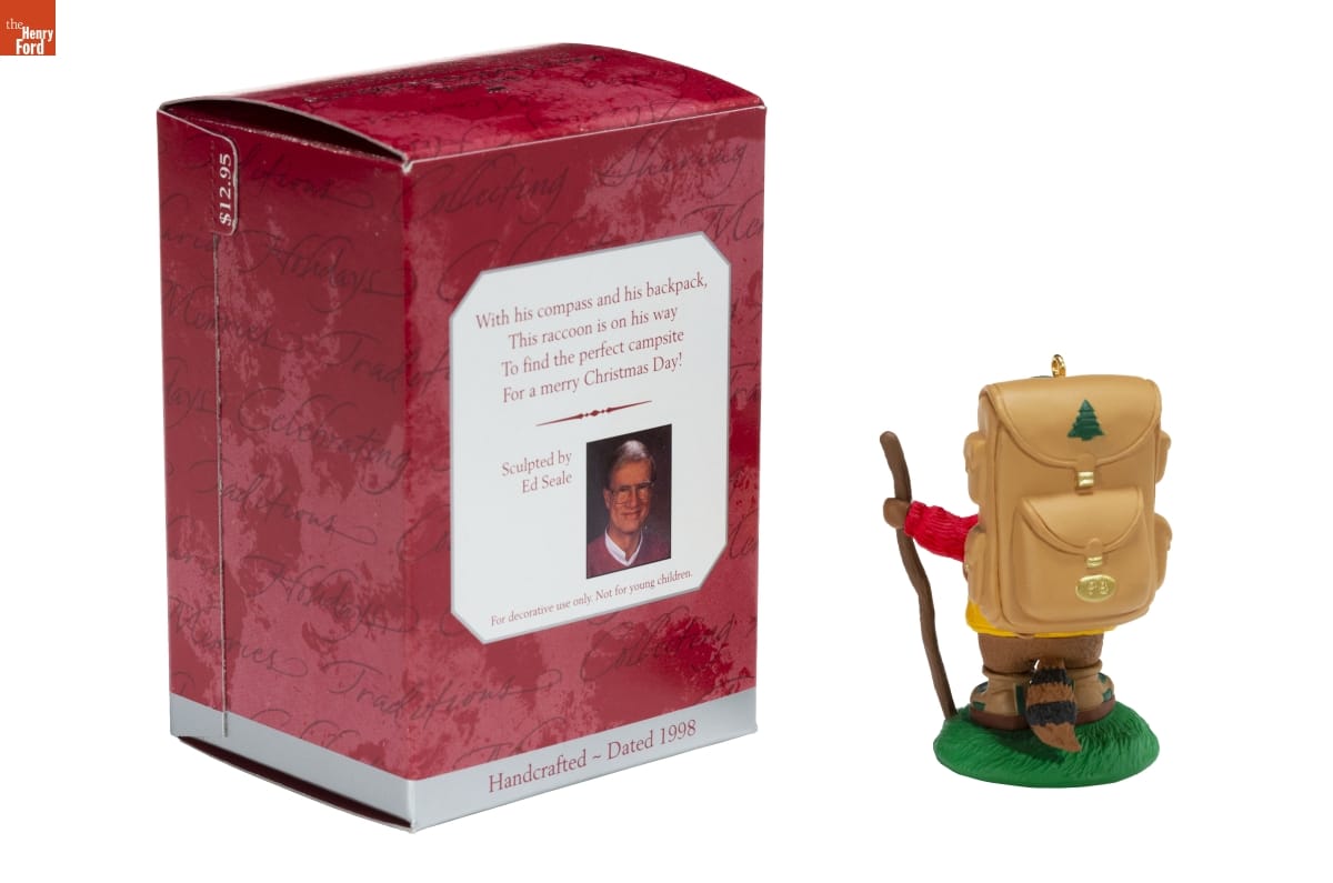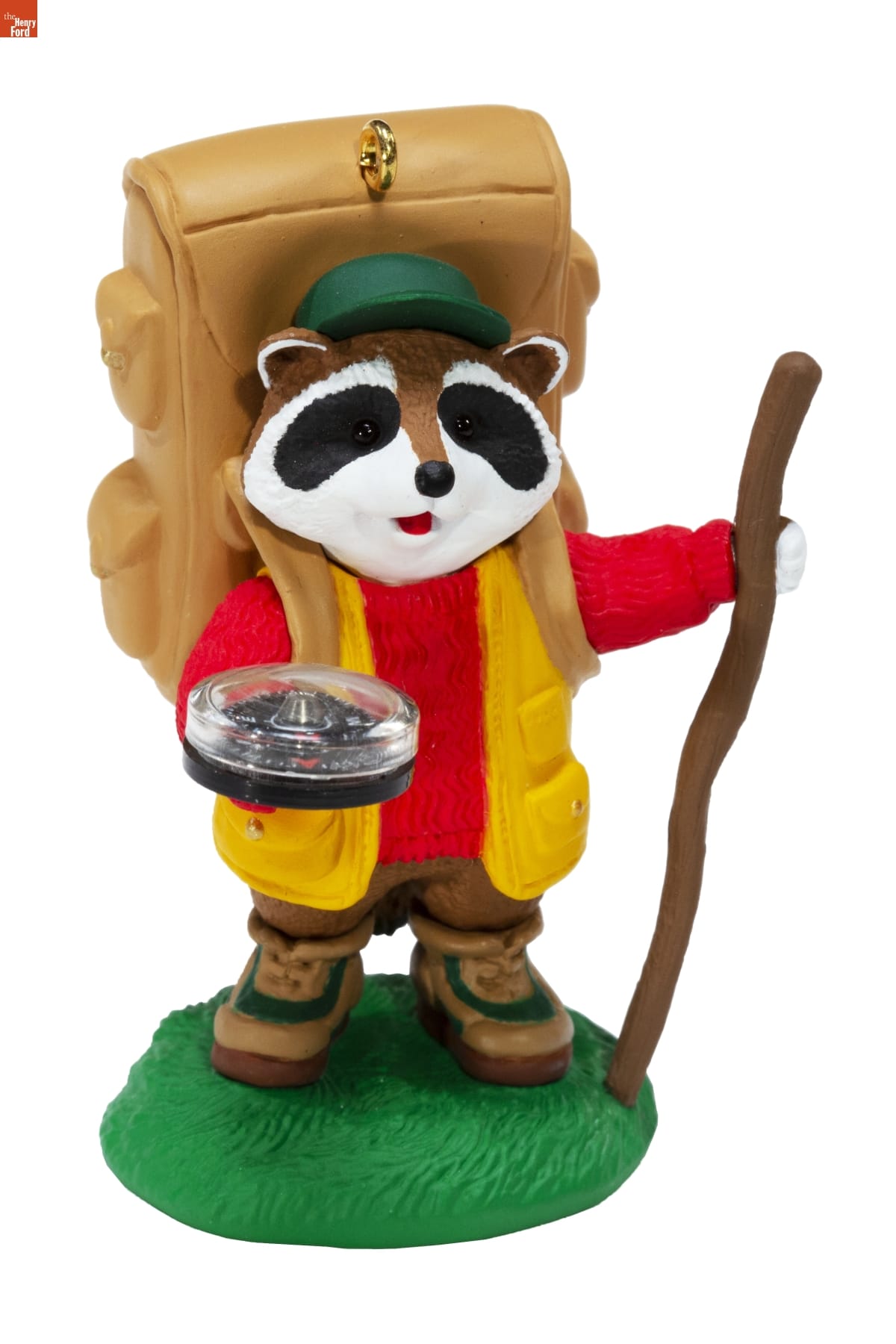 With his compass and his backpack, / This raccoon is on his way / To find the perfect campsite / For a merry Christmas Day! / Sculpted by / Ed Seale / For decorative use only. Not for young children. / Handcrafted - Dated 1998