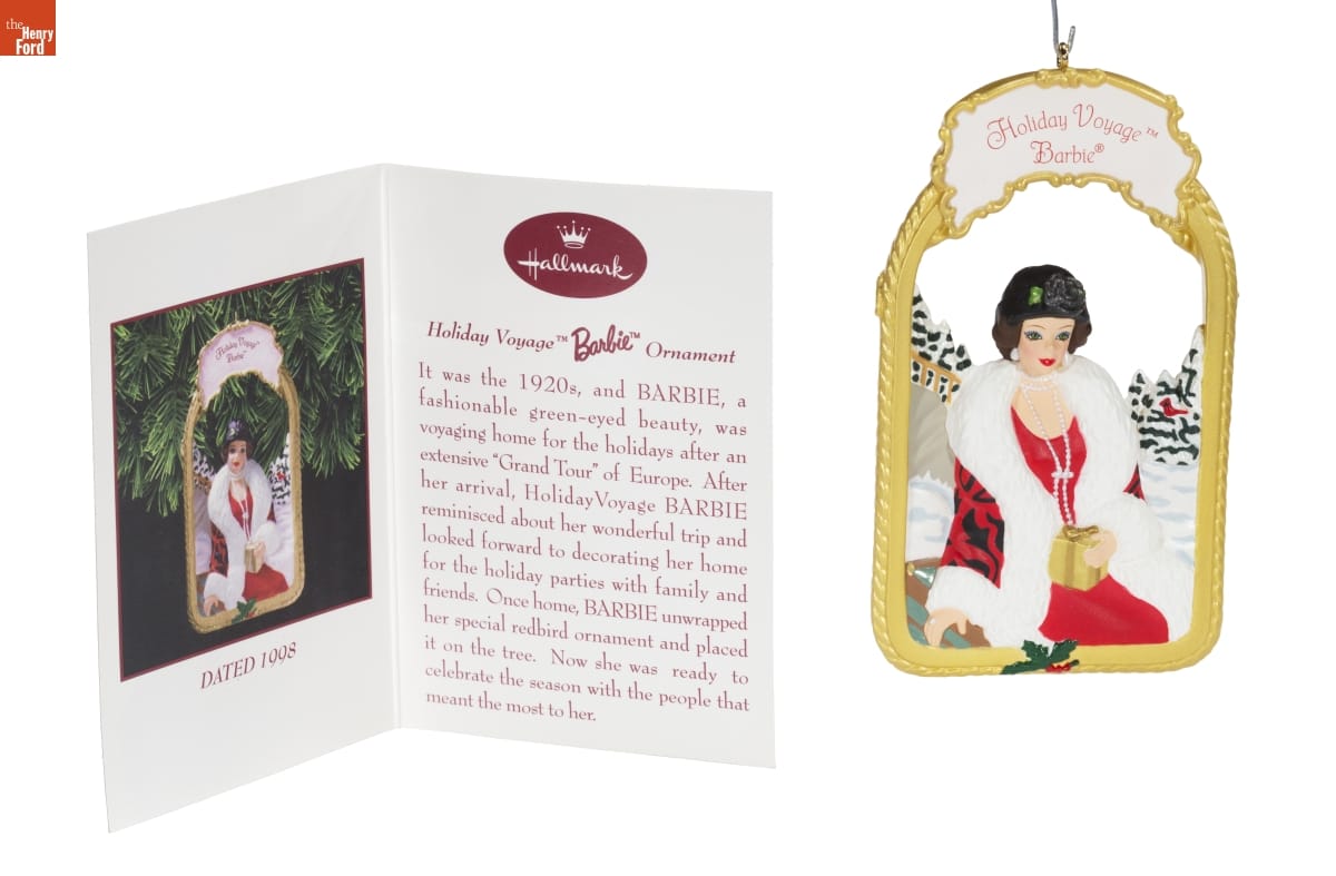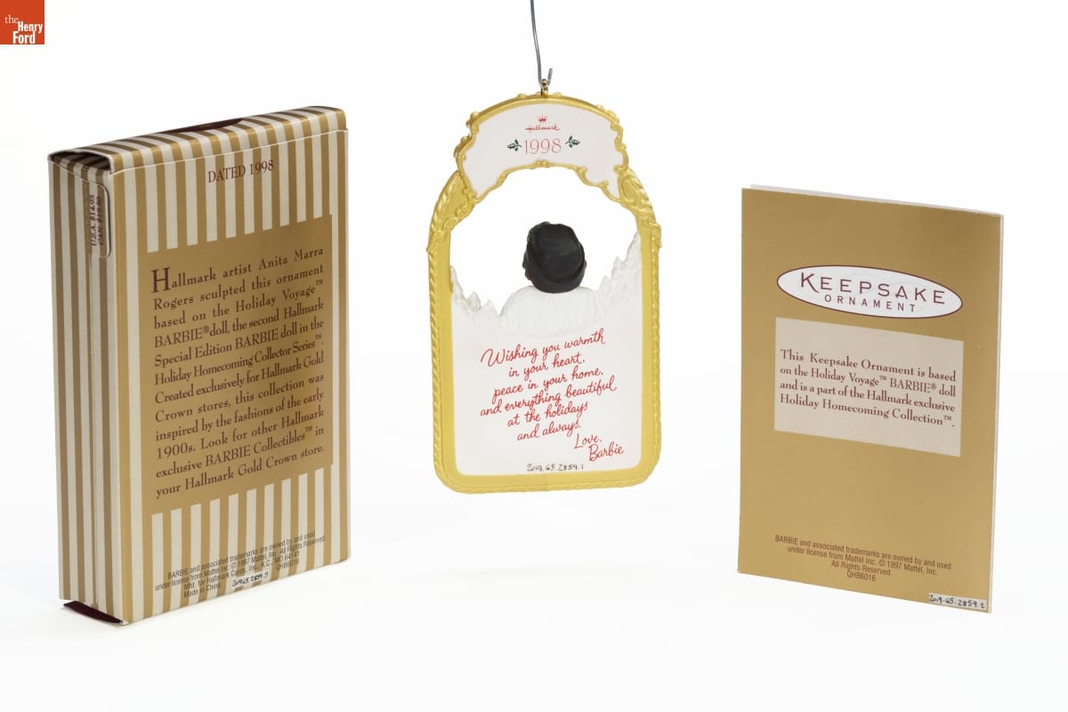 DATED 1998 / Hallmark artist Anita Marra / Rogers sculpted this ornament / based on the Holiday Voyage / BARBIE doll, the second Hallmark / Special Edition BARBIE doll in the / Holiday Homecoming Collector Series. / Created exclusively for Hallmark Gold / Crown stores, this collection was / inspired by the fashions of the early / 1900s. Look for other Hallmark / exclusive BARBIE Collectibles in / your Hallmark Gold Crown store. / BARBIE and associated trademarks are owned by and used / under license from Mattel Inc. (C) 1997 Mattel, Inc. All Rights Reserved. / Mfd. for Hallmark Cards, Inc., K.C., MO 64141 / Made in China QHB6016