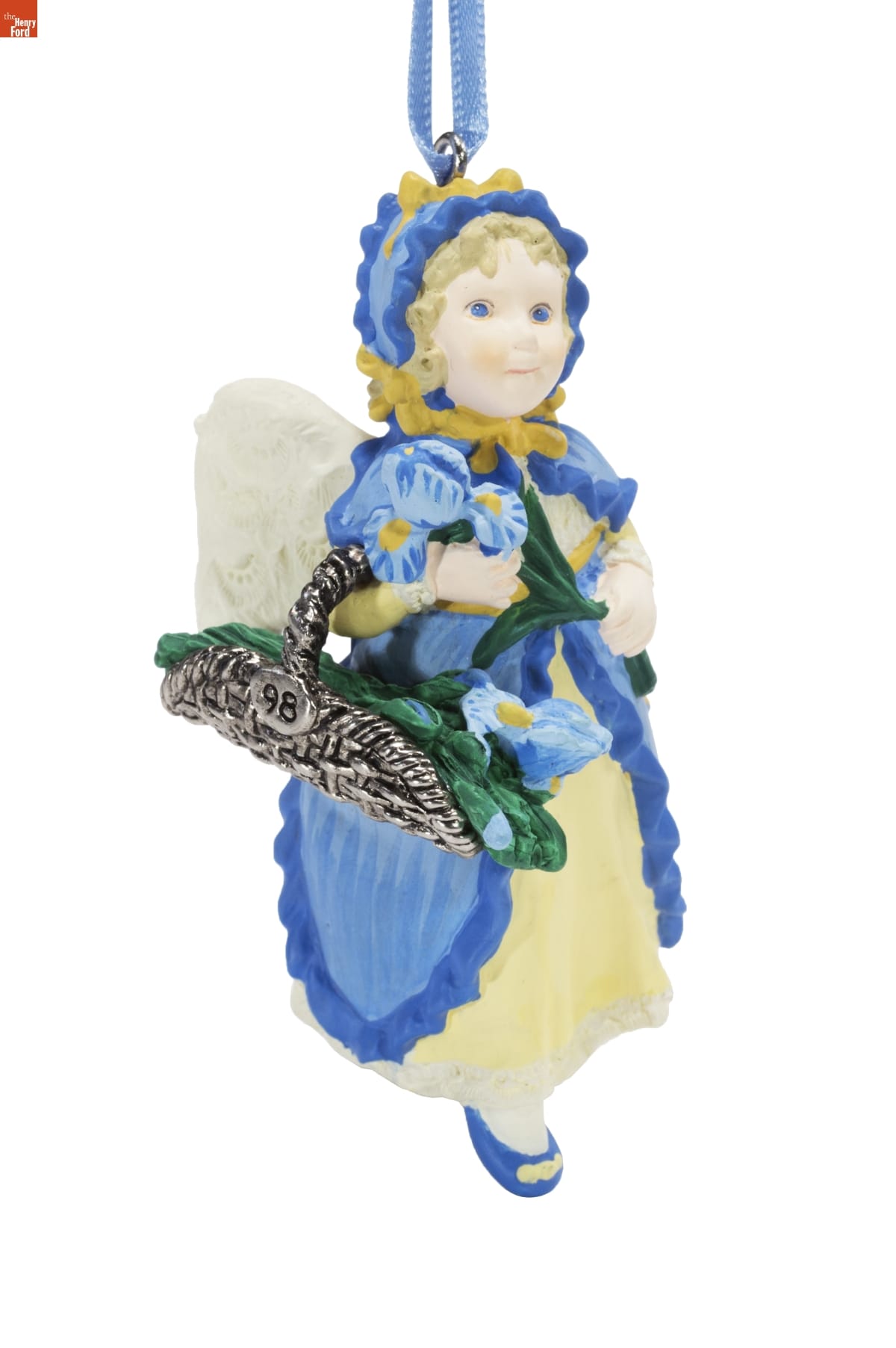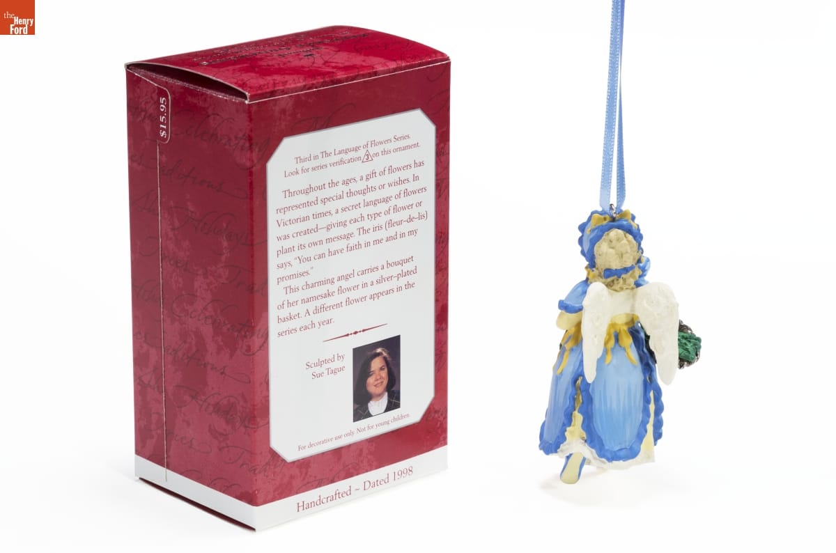 Third in The Language of Flowers Series. / Look for series verification 3 on this ornament. / Throughout the ages, a gift of flowers has / represented special thoughts or wishes. In / Victorian times, a secret language of flowers / was created--giving each type of flower or / plant its own message. The iris (fleur-de-lis) / says, "You can have faith in me and in my / promises." / This charming angel carries a bouquet / of her namesake flower in a silver-plated / basket. A different flower appears in the series each year. / Sculpted by / Sue Tague / For decorative use only. Not for young children. / Handcrafted - Dated 1998