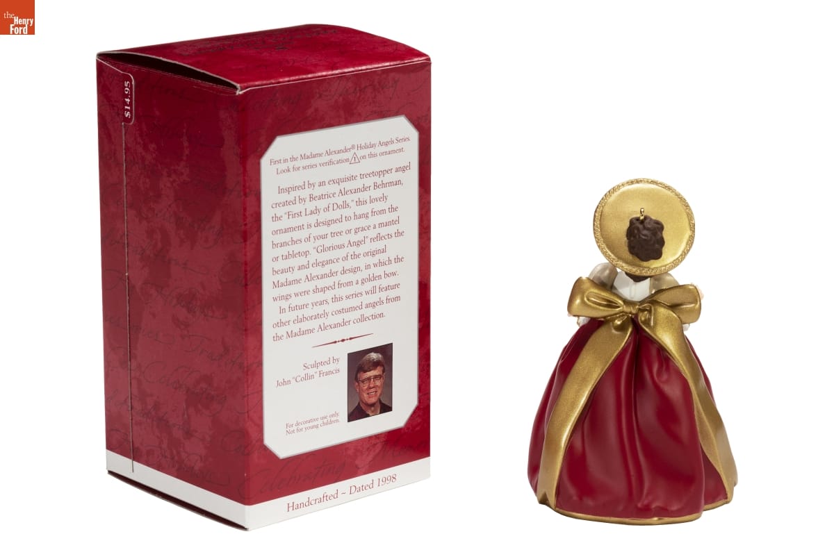 First in the Madame Alexander(R) Holiday Angels Series / Look for series verification 1 on this ornament. / Inspired by an exquisite treetopper angel / created by Beatrice Alexander Behrman, / the "First Lady of Dolls," this lovely / ornament is designed to hang from the / branches of your tree or grace a mantel / or tabletop. "Glorious Angel" reflects the / beauty and elegance of the original / Madame Alexander design, in which the wings were shaped from a golden bow. / In future years, this series will feature / other elaborately costumed angels from / the Madame Alexander collection. / Sculpted by / John "Collin" Francis / For decorative use only. / Not for young children. / Handcrafted - Dated 1998