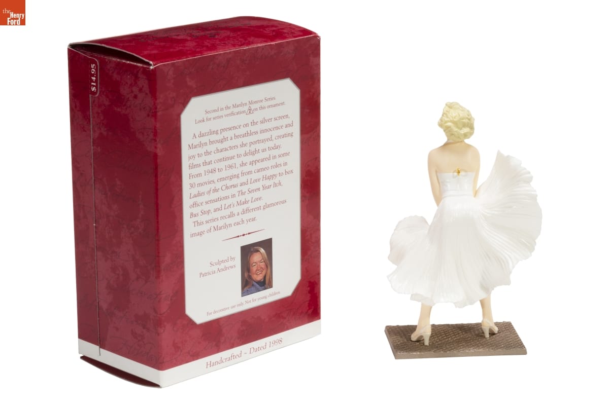 Second in the Marilyn Monroe Series / Look for series verification 2 on this ornament. / A dazzling presence on the silver screen, / Marilyn brought a breathless innocence and / joy to the characters she portrayed, creating / films that continue to delight us today. / From 1948 to 1961, she appeared in some / 30 movies, emerging from cameo roles in / Ladies of the Chorus and Love Happy to box / office sensations in The Seven Year Itch, / Bus Stop, and Let's Make Love. / This series recalls a different glamorous / image of Marilyn each year. / Sculpted by / Patricia Andrews. / For decorative use only. Not for young children. / Handcrafted - Dated 1998