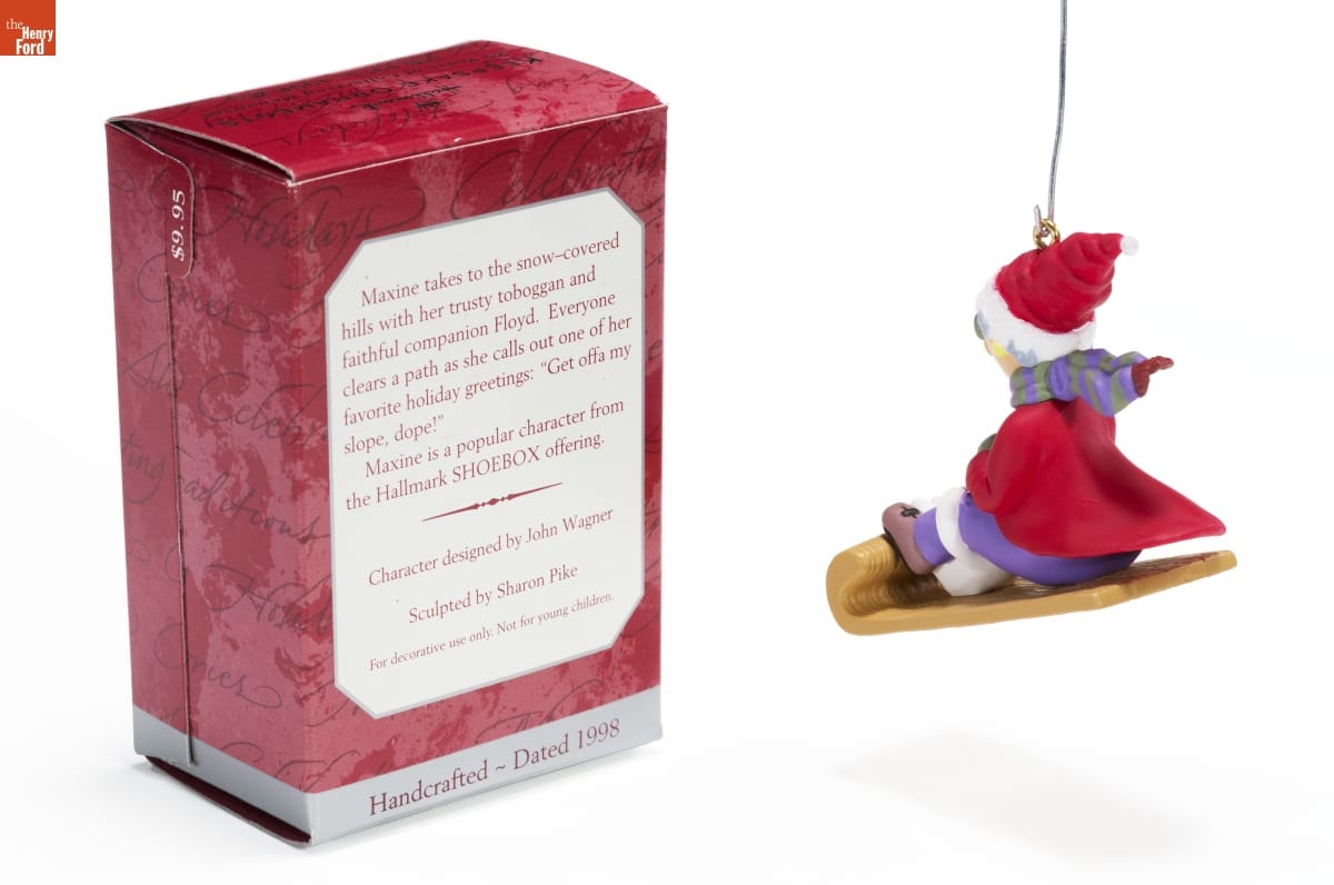 Maxine takes to the snow-covered / hills with her trusty toboggan and / faithful companion Floyd. Everyone / clears a path as she calls out one of her / favorite holiday greetings: "Get offa my / slope, dope!" / Maxine is a popular character from / the Hallmark SHOEBOX offering. / Character designed by John Wagner. / Sculpted by Sharon Pike / For decorative use only. Not for young children. / Handcrafted - 1998