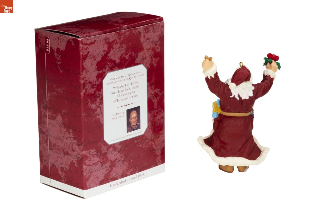 Ninth in the Merry Olde Santa Series. / Look for series verification 9 on this ornament. / With a big Ho! Ho! Ho! / Santa heads for his sleigh-- / All set for the fun / Of his once-a-year day! / Sculpted by / Duane Unruh / For decorative use only. Not for young children / Handcrafted - Dated 1998