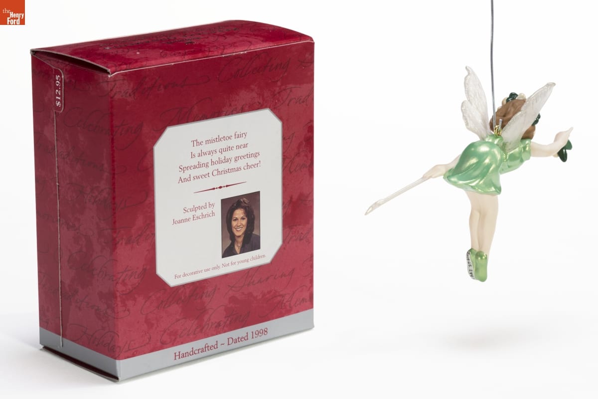 The mistletoe fairy / Is always quite near / Spreading holiday greetings / And sweet Christmas cheer! / Sculpted by / Joanne Eschrich / For decorative use only. Not for young children. / Handcrafted - Dated 1998