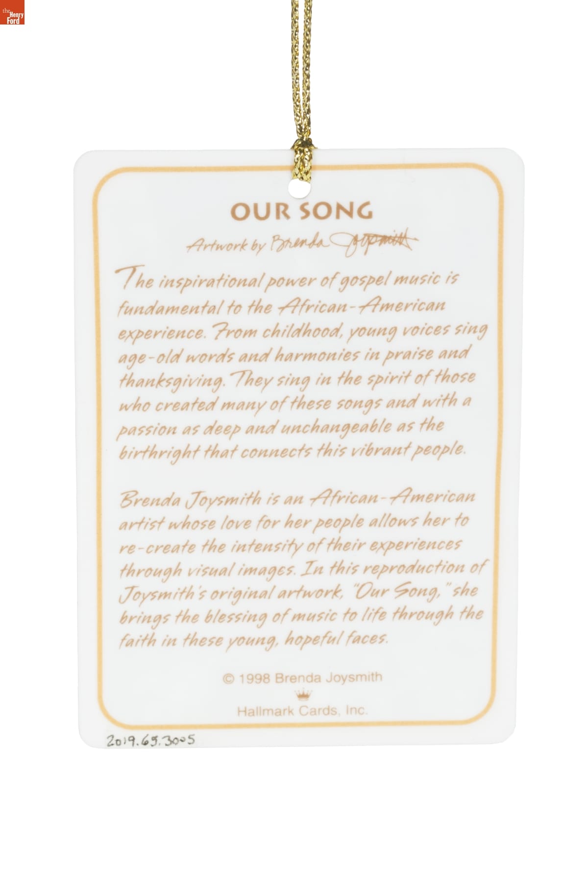 OUR SONG / Artwork by Brenda Joysmith / The inspirational power of gospel music is / fundamental to the African American / experience. From childhood, young voices sing / age-old words and harmonies in praise and / thanksgiving. They sing in the spirit of those / who created many of these songs and with a / passion as deep and unchangeable as the / birthright that connects this vibrant people. / Brenda Joysmith is an African-American / artist whose love for her people allows her to / re-create the intensity of their experiences / through visual images. In this reproduction of / Joysmith's original artwork, "Our Song," she / brings the blessing of music to life through the / faith in these young, hopeful faces. / (C) 1998 Brenda Joysmith / Hallmark Cards, Inc.