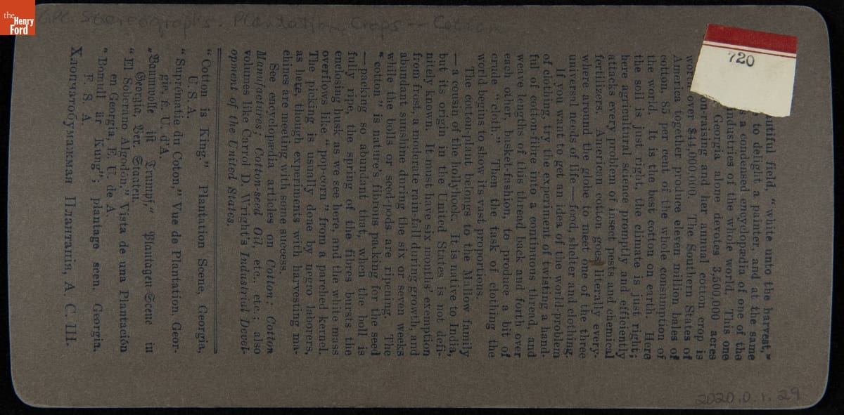 This stereograph depicts people picking cotton while a man on horseback oversees the work. This juxtaposition and the term, "plantation," reinforced associations between African Americans and enslavement. The message, conveyed in six languages, reached consumers as violence against African Americans increased and as state laws and the Plessy v Ferguson court decision legalized racial discrimination.