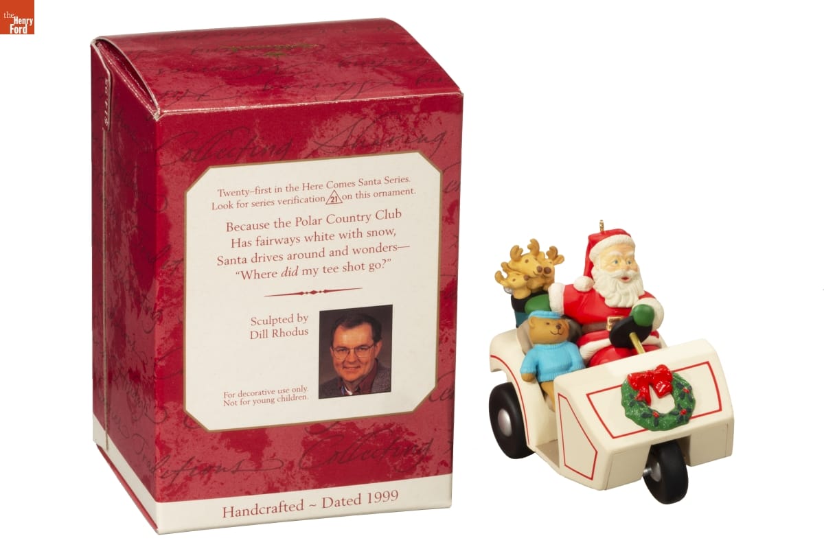 Twenty-first in the Here Comes Santa Series. / Look for series verification 21 on this ornament. / Because the Polar Country Club / Has fairways white with snow, / Santa drives around and wonders- / "Where did my tee shot go?" / Sculpted by / Dill Rhodus / For decorative use only / Not for young children. / Handcrafted - Dated 1999