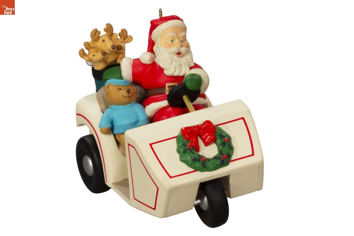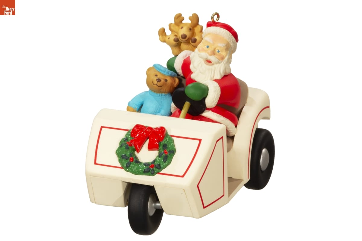 Hallmark's long-running "Here Comes Santa" series featured jolly St. Nick using different forms of transportation. The series began in 1979 depicting Santa driving an antique car. By the time the series ended in 2003, Santa had hopped a ride on a range of vehicles, including a fire truck, golf cart, rocket, snowplow, tractor, trolley, semitruck, and a Soap Box Derby car.