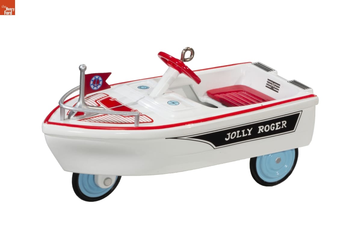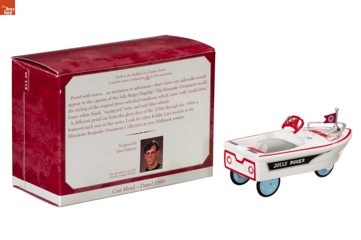 Sixth in the Kiddie Car Classics Series. / Look for series verification 6 on this ornament. / Paved with waves...an invitation to adventure-that's how city sidewalks would / appear to the captain of the Jolly Roger Flagship! This Keepsake Ornament recalls / the styling of the original three-wheeled runabout, which came with "pedal drive," / foam-white finish, "racing red" trim, and surf-blue wheels. / A different pedal car from the glory days of the 1930s through the 1960s is / featured each year in the series. Look for other Kiddie Cars models in the / Miniature Keepsake Ornament Collection at your Hallmark retailer. / Sculpted by / Don Palmiter / For decorative use only. / Not for young children. / Cast Metal - Dated 1999