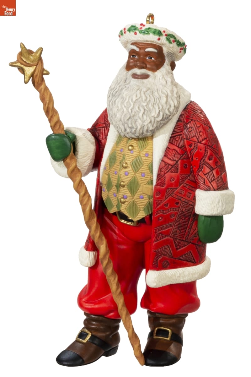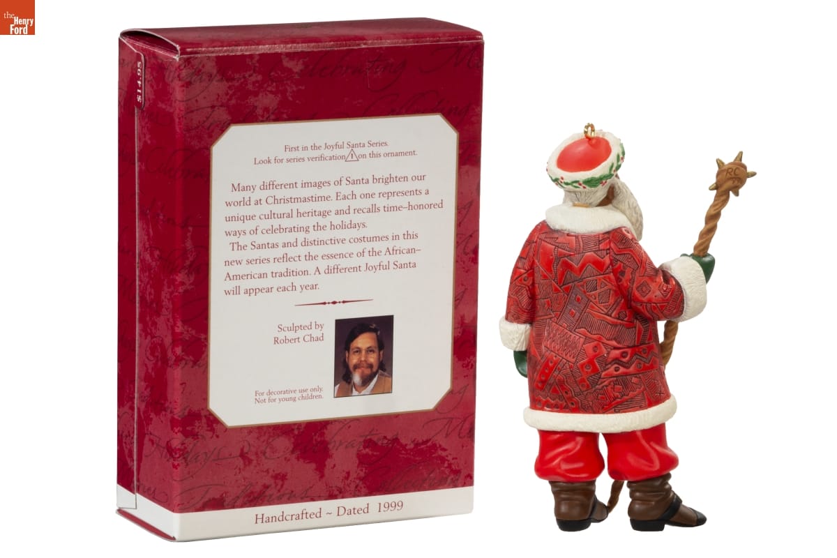 First in the Joyful Santa Series. / Look for series verification 1 on this ornament. / Many different images of Santa brighten our / world at Christmastime. Each one represents a / unique cultural heritage and recalls time-honored / ways of celebrating the holidays. / The Santas and distinctive costumes in this / new series reflect the essence of the African- / American tradition. A different Joyful Santa / will appear each year. / Sculpted by / Robert Chad / For decorative use only. / Not for young children. / Handcrafted - Dated 1999