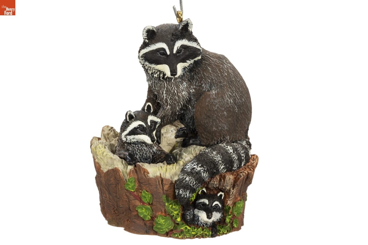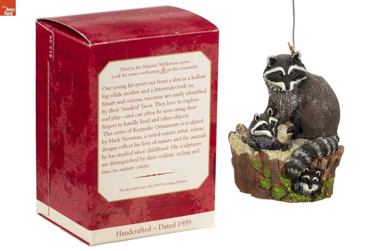 Third in the Majestic Wilderness series. / Look for series verification 3 on this ornament. / One young kit peers out from a den in a hollow / log while mother and a littermate look on. / Smart and curious, raccoons are easily identified / by their "masked" faces. They love to explore / and play-and can often be seen using their / fingers to handle food and other objects. / This series of Keepsake Ornaments is sculpted / by Mark Newman, a noted nature artist, whose / designs reflect his love of nature and the animals / he has studied since childhood. His sculptures / are distinguished by their realistic styling and / true-to-nature colors. / For decorative use only. Not for young children. / Handcrafted - Dated 1999