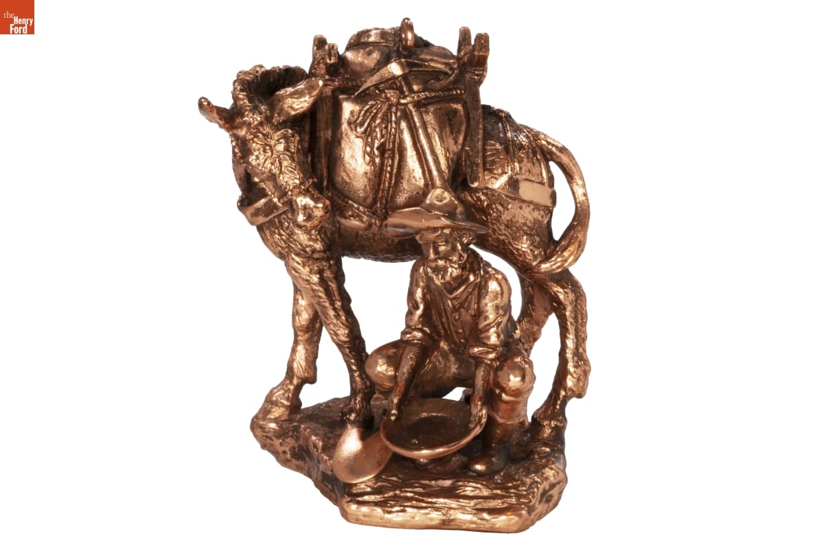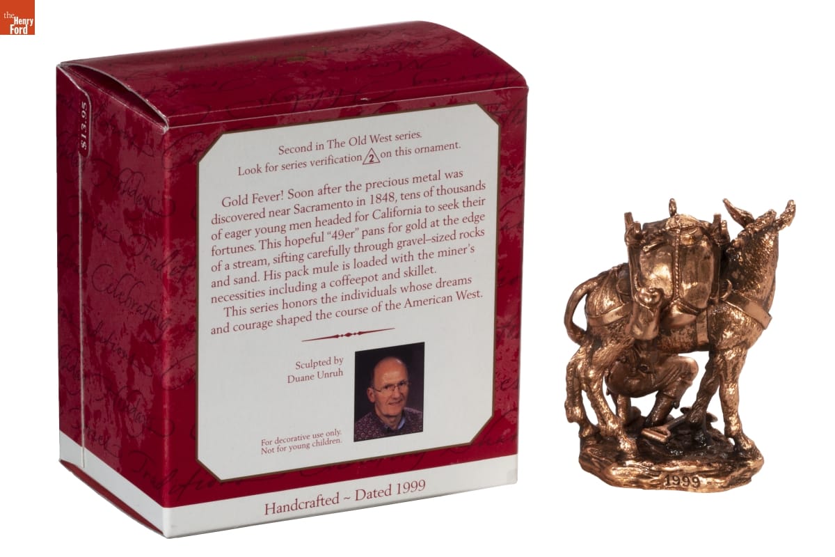 Second in the The Old West series. / Look for series verification 2 on this ornament. / Gold Fever! Soon after the precious metal was / discovered near Sacramento in 1848, tens of thousands / of eager young men headed for California to seek their / fortunes. This hopeful "49er" pans for gold at the edge / of a stream, sifting carefully through gravel-sized rocks / and sand. His pack mule is loaded with the miner's / necessities including a coffeepot and skillet. / This series honors the individuals whose dreams / and courage shaped the course of the American West. / Sculpted by / Duane Unruh / For decorative use only. / Not for young children. / Handcrafted - Dated 1999