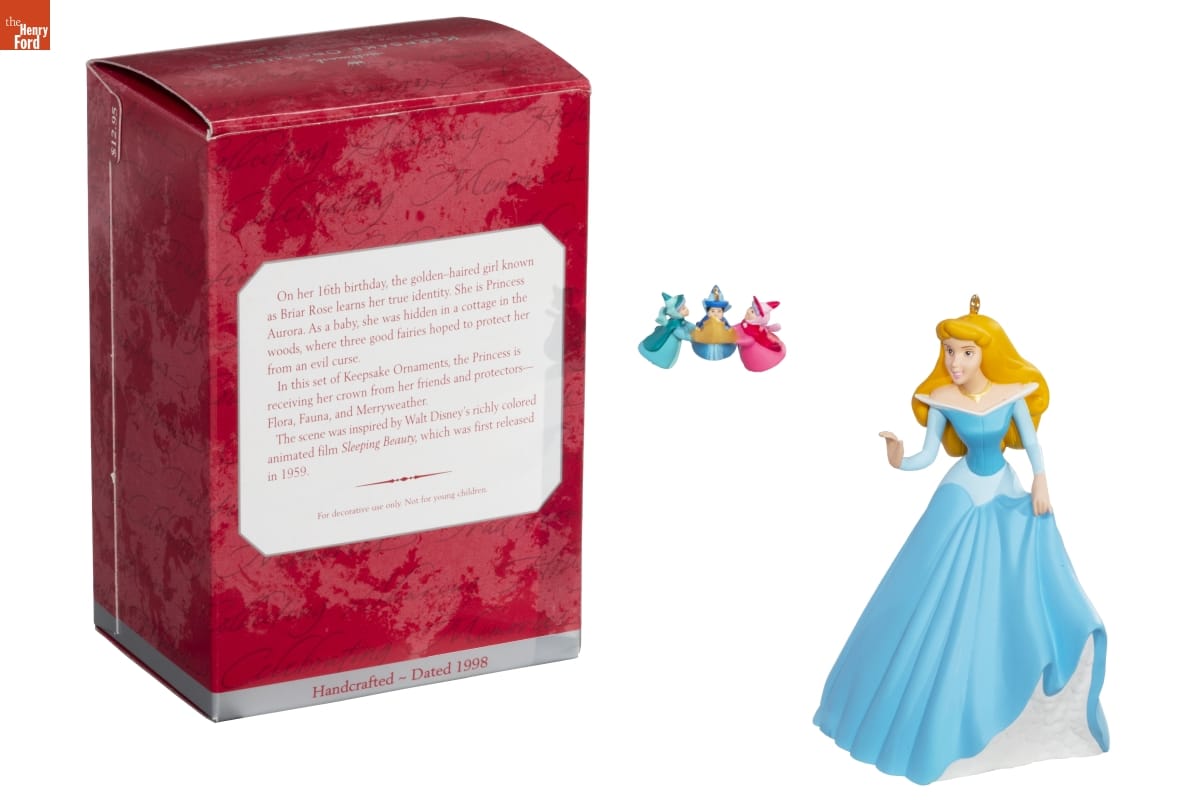 On her 16th birthday, the golden-haired girl known / as Briar Rose learns her true identity. She is Princess / Aurora. As a baby, she was hidden in a cottage in the / woods, where three good fairies hoped to protect her / from an evil curse. / In this set of Keepsake Ornaments, the Princess is / receiving her crown from her friends and protectors-- / Flora, Fauna, and Merryweather. / The scene was inspired by Walt Disney's richly colored / animated film Sleeping Beauty, which was first released / in 1959. / For decorative use only. Not for young children. / Handcrafted - Dated 1998