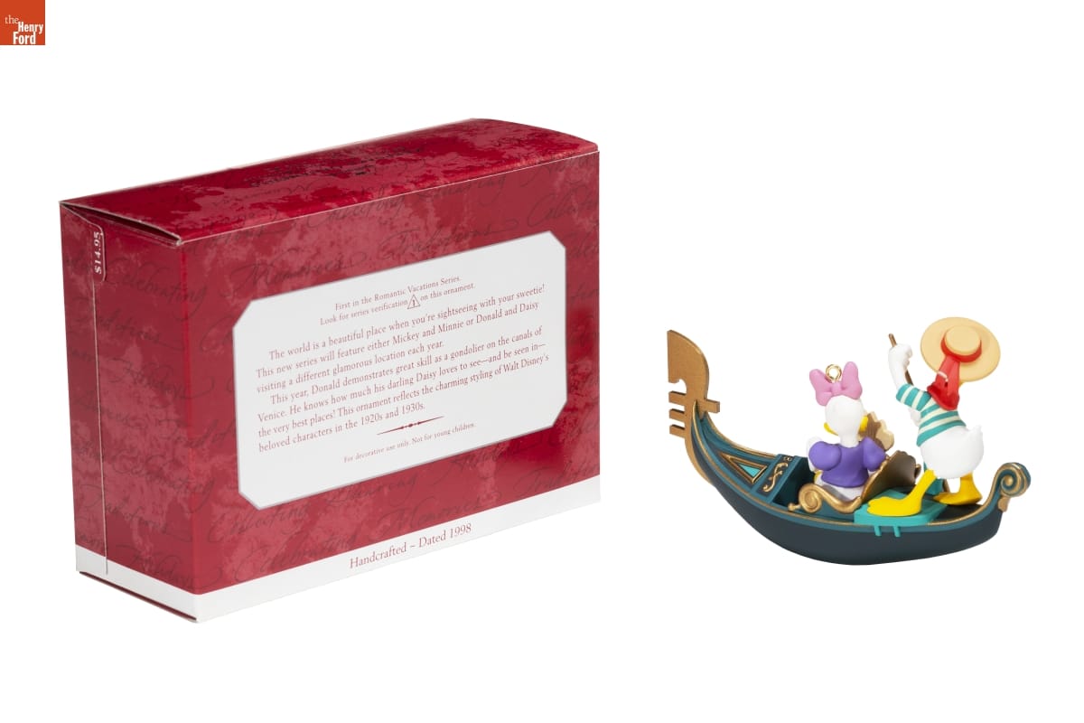 First in the Romantic Vacations Series. / Look for series verification 1 on this ornament. / The world is a beautiful place when you're sightseeing with your sweetie! / This new series will feature either Mickey and Minnie or Donald and Daisy, visiting a different glamorous location each year. / This year, Donald demonstrates great skill as a gondolier on the canals of / Venice. He knows how much his darling Daisy loves to see--and be seen in-- / the very best places! This ornament reflects the charming styling of Walt Disney's / beloved characters in the 1920s and 1930s. / For decorative use only. Not for young children. / Handcrafted - Dated 1998