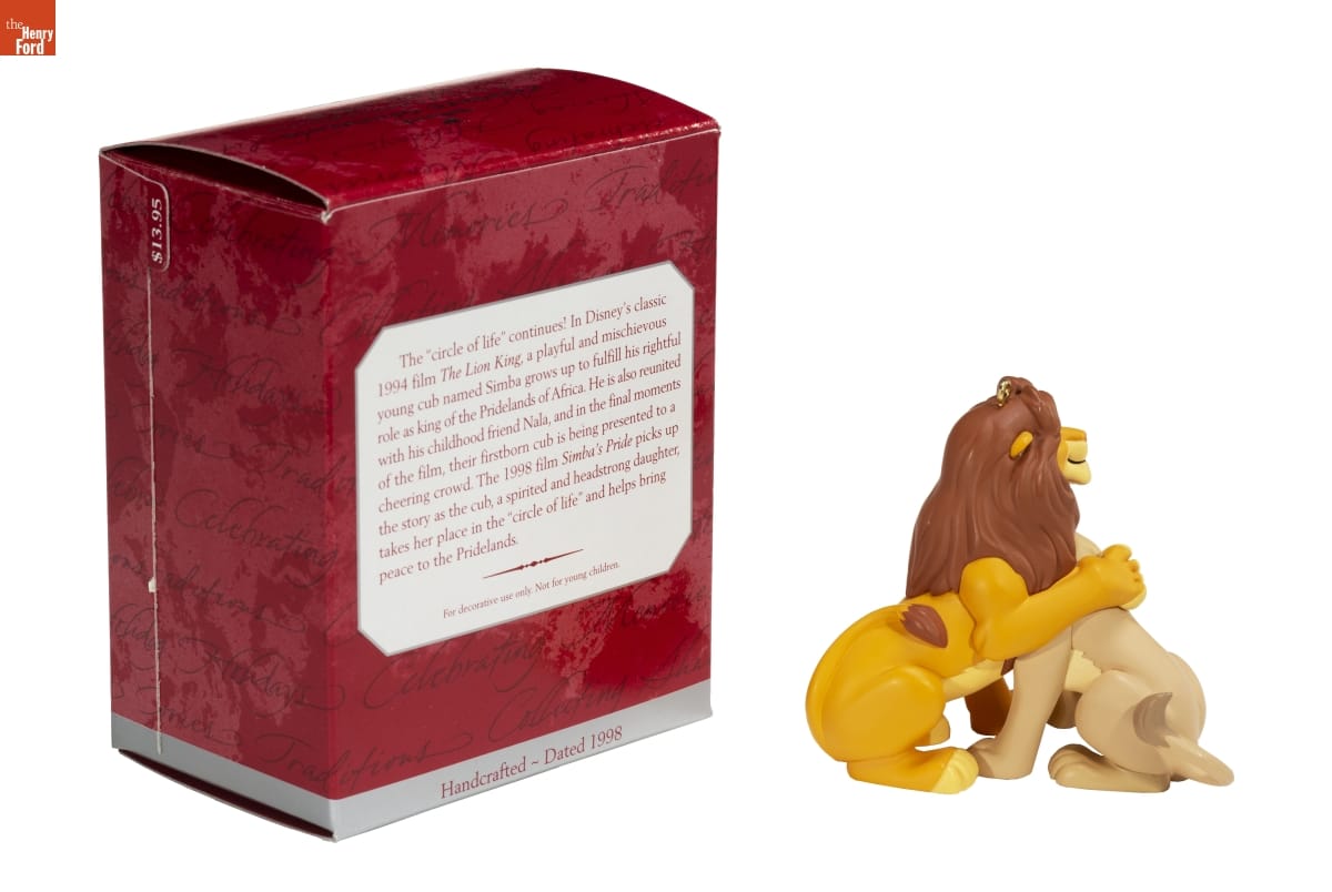 The "circle of life" continues! In Disney's classic / 1994 film The Lion King, a playful and mischievous / young cub named Simba grows up to fulfill his rightful / role as king of the Pridelands of Africa. He is also reunited / with his childhood friend Nala, and in the final moments / of the film, their firstborn cub is being presented to a / cheering crowd. The 1998 film Simba's Pride picks up / the story as the cub, a spirited and headstrong daughter, / takes her place in the "circle of life" and helps bring / peace to the Pridelands. / For decorative use only. Not for young children. / Handcrafted - Dated 1998