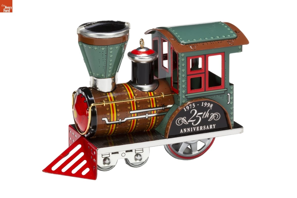 Before Hallmark Keepsake Ornaments were introduced / in 1973, most Americans decorated their Christmas trees with / plain ball ornaments. Over the years, it has become a holiday / tradition to collect beautifully decorated Keepsake Ornraments / which reflected cherished symbols of the season. / Recreated by Linda Sickman to commemorate the 25th / Anniversary of Hallmark Keepsake Ornaments, the 1988 "Tin / Locomotive" returns to the tracks to celebrate 25 years / of collecting memories. This popular series, which retired / in 1989, depicted eight models of locomotives inspired / by trains from the early days of American transportation. / Sculpted by / Linda Sickman / For decorative use only. Not for young children. / Tin - Anniversary Dated 1973-1998