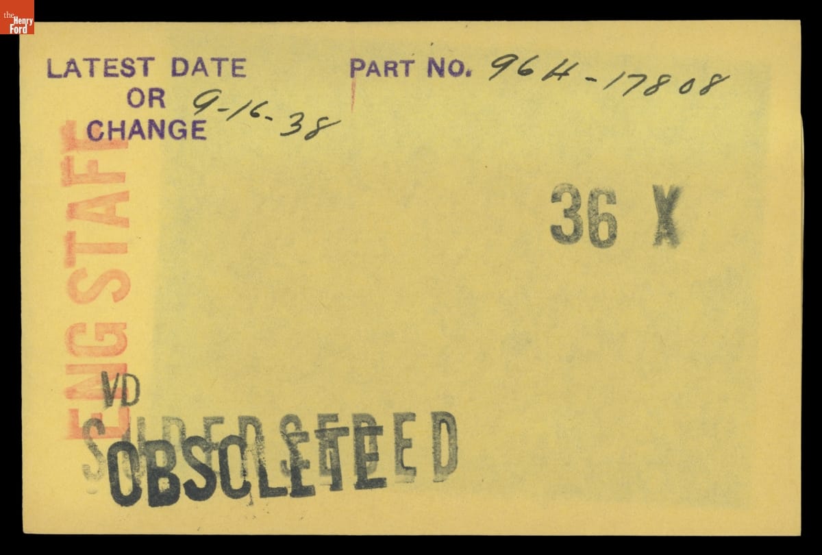 The Ford Motor Company created over a million parts drawings from 1903 to 1957. Many of these drawings specify engineering requirements for the components of Ford-made vehicles--including automobiles, trucks, tractors, military vehicles and Tri-motor airplanes. Others document assembly components, stages of casting and forging, or experimental designs. Beginning in the 1940s, Ford transferred the drawings to microfilm.
