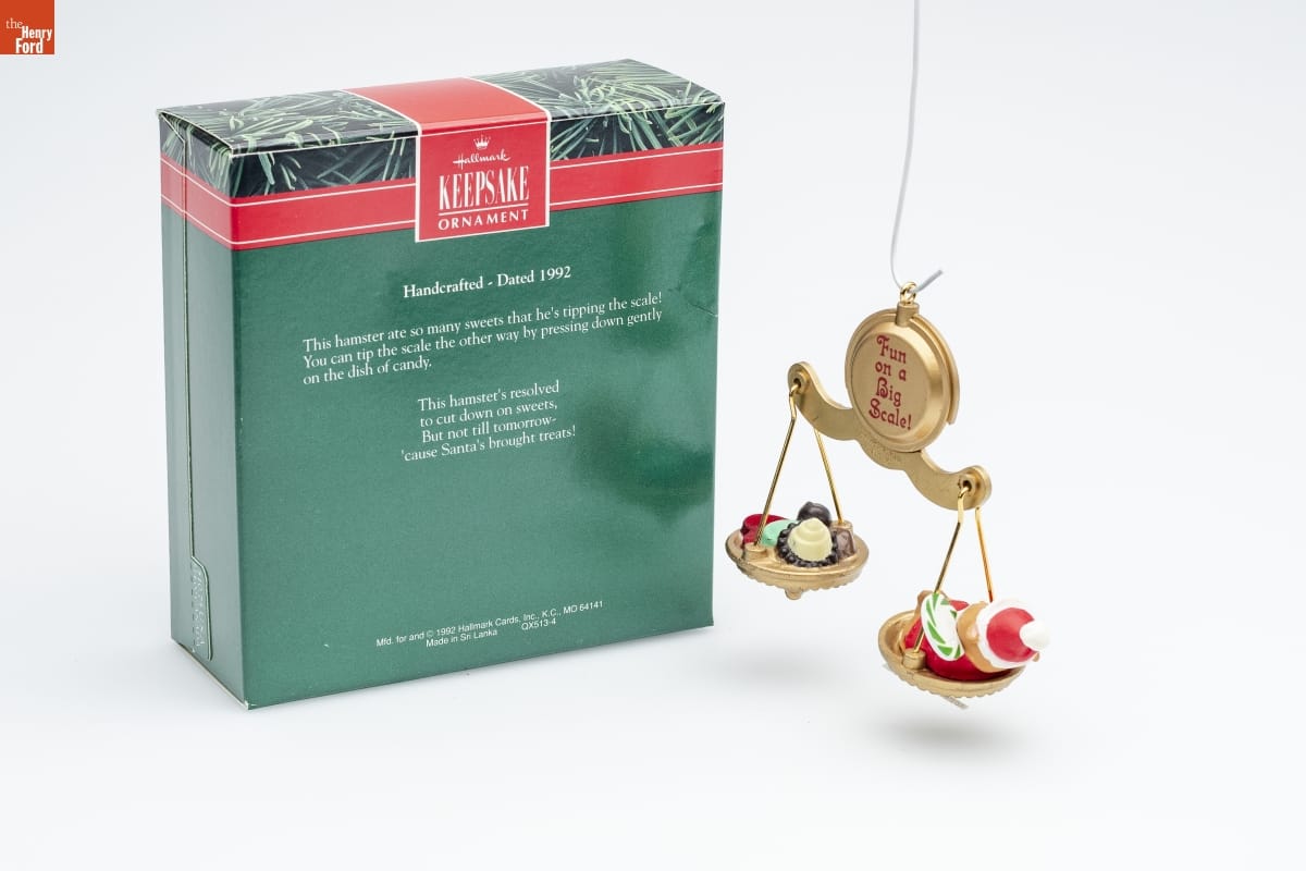 Hallmark / KEEPSAKE / ORNAMENT / Handcrafted - Dated 1992 / This hamster ate so many sweets that he's tipping the scale! / You can tip the scale the other way by pressing down gently / on the dish of candy. / This hamster's resolved / to cut down on sweets, / But not till tomorrow- / 'cause Santa's brought treats! / Mfd. for and (C) 1992 Hallmark Cards, Inc., K.C., MO 64141 / Made in Sri Lanka QX513-4