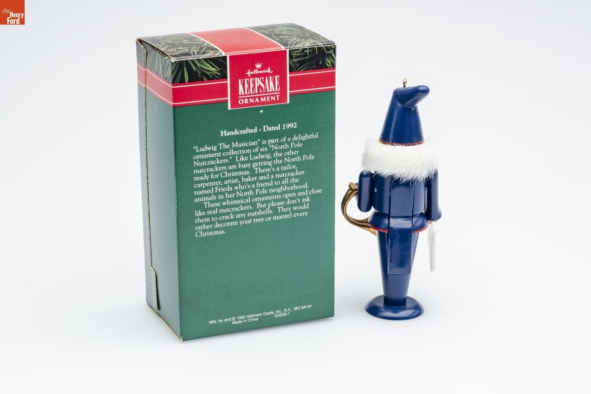 Hallmark / KEEPSAKE / ORNAMENT / Handcrafted - Dated 1992 / "Ludwig The Musician" is part of a delightful / ornament collection of six "North Pole / Nutcrackers." Like Ludwig, the other / nutcrackers are busy getting the North Pole / ready for Christmas. There's a tailor, / carpenter, artist, baker and a nutcracker / named Frieda who's a friend to all the / animals in her North Pole neighborhood. / These whimsical ornaments open and close / like real nutcrackers. But please don't ask / them to crack any nutshells. They would / rather decorate your tree or mantel every / Christmas. / Mfd. for and (C) 1992 Hallmark Cards, Inc., K.C., MO 64141 / Made in China. QX528-1