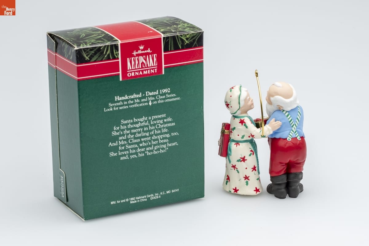 Hallmark / KEEPSAKE / ORNAMENT / Handcrafted - Dated 1992 / Seventh in the Mr. and Mrs. Claus Series. / Look for series verification 7 on this ornament. / Santa bought a present / for his thoughtful, loving wife. / She's the merry in his Christmas / and the darling of his life. / And Mrs. Claus went shopping too, / for Santa, who's her beau. / She loves his dear and giving heart, / and, yes, his "ho-ho-ho!" / Mfd. for and (C) 1992 Hallmark Cards, Inc., K.C., MO 64141 / Made in China QX429-4