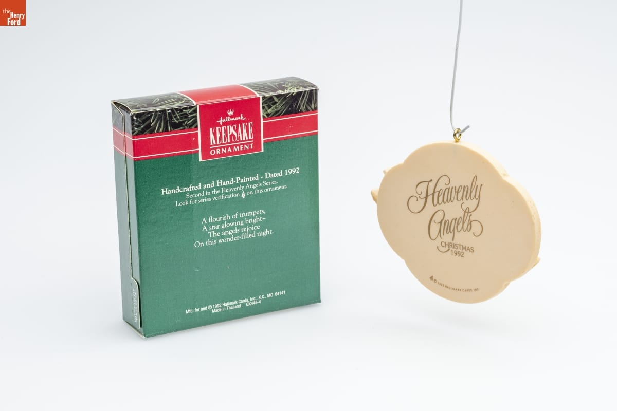 Hallmark / KEEPSAKE / ORNAMENT / Handcrafted and Hand-Painted - Dated 1992 / Second in the Heavenly Angels Series. / Look for series verification 2 on this ornament. / A flourish of trumpets, / A star glowing bright- / The angels rejoice / On this wonder-filled night. / Mfd. for and (C) 1992 Hallmark Cards, Inc., K.C., MO 64141 / Made in Thailand QX445-4